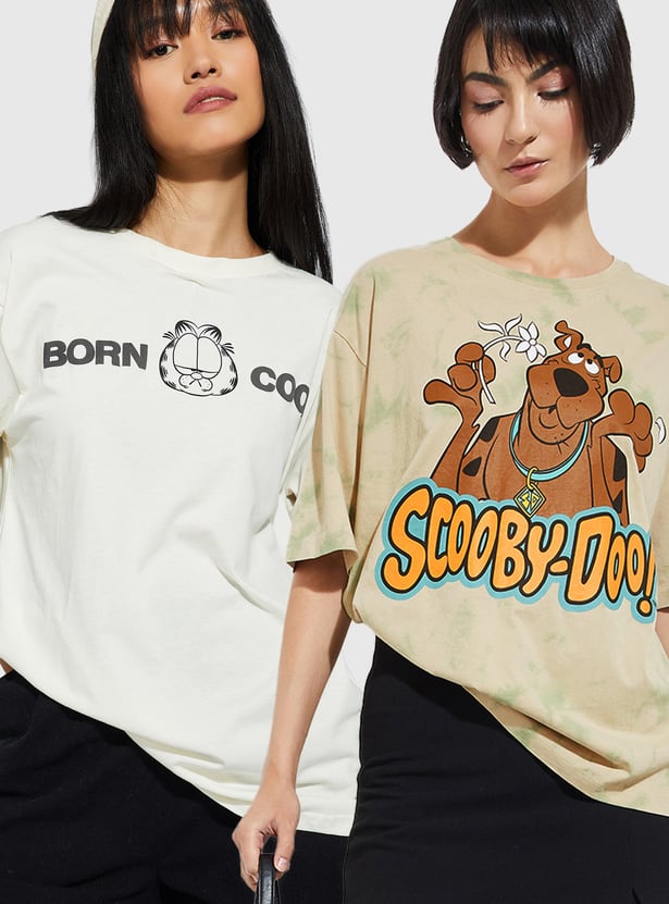 Casual and fun, these character print oversized t-shirts in a pack of 2 are designed with a round neck and half sleeves for a relaxed fit. One features a playful Scooby-Doo print, while the other showcases the iconic Garfield, making them perfect for adding character-inspired charm to your everyday wardrobe.