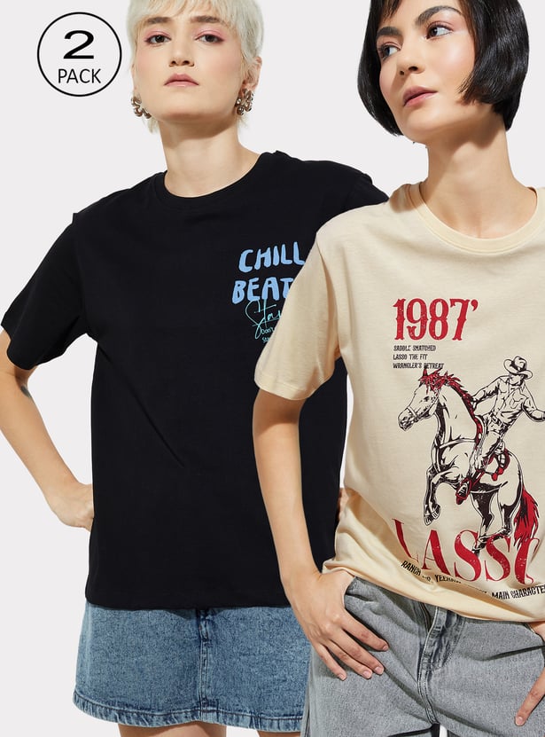 This pack of 2 printed T-shirts features round necklines and half sleeves for a comfortable, easygoing fit. The playful prints add a pop of personality to your everyday wardrobe.