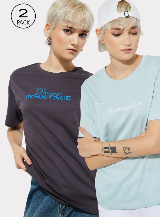 Add a playful touch to your everyday wardrobe with this pack of 2 printed T-shirts. Featuring a classic round neck and half sleeves, they combine comfort with stylish prints for versatile casual wear.