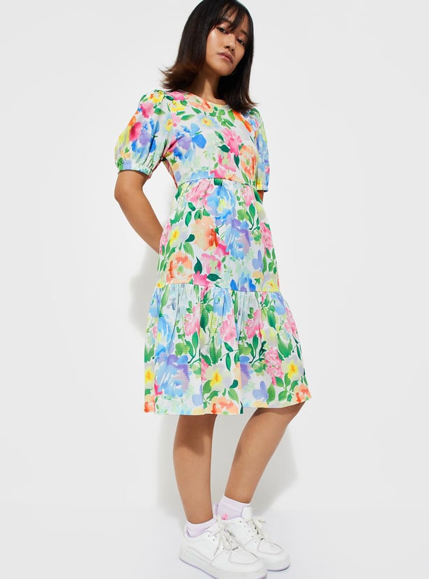 Get ready for summer in style with this must-have printed dress. Featuring a tiered profile, round neck, puffed sleeves, and knee-length construction, it's the epitome of summer elegance.