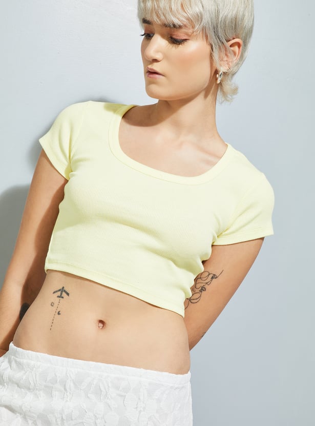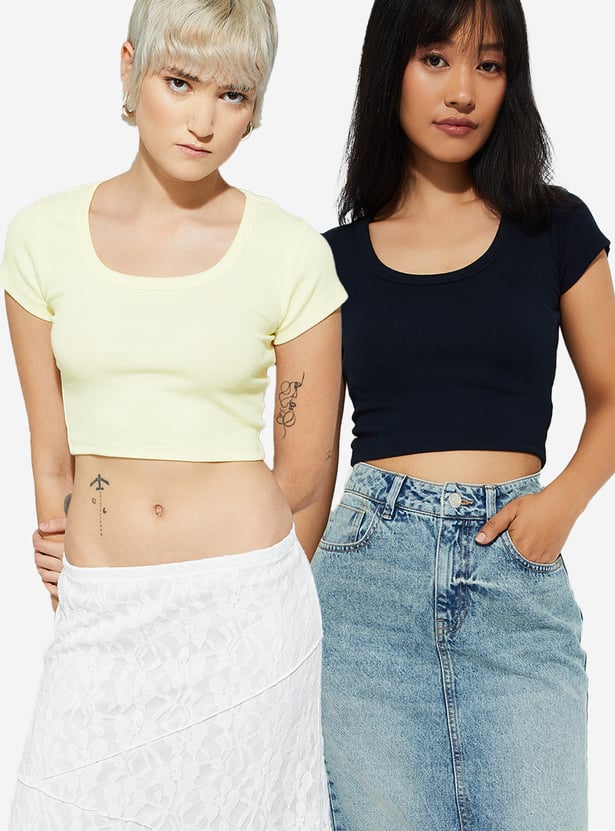 Elevate your everyday essentials with this pack of cropped tops in assorted tones. It includes a ribbed design, a round neck, and half sleeves.