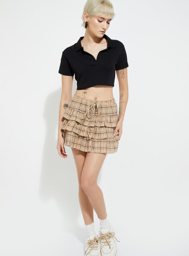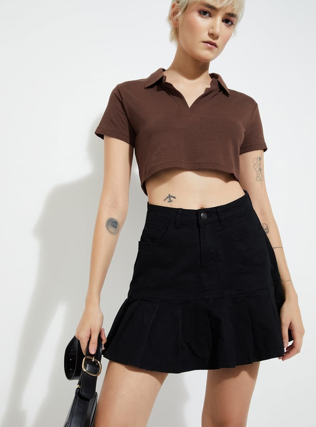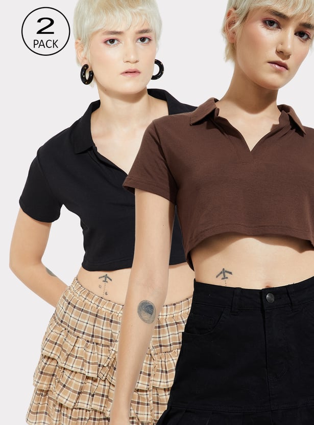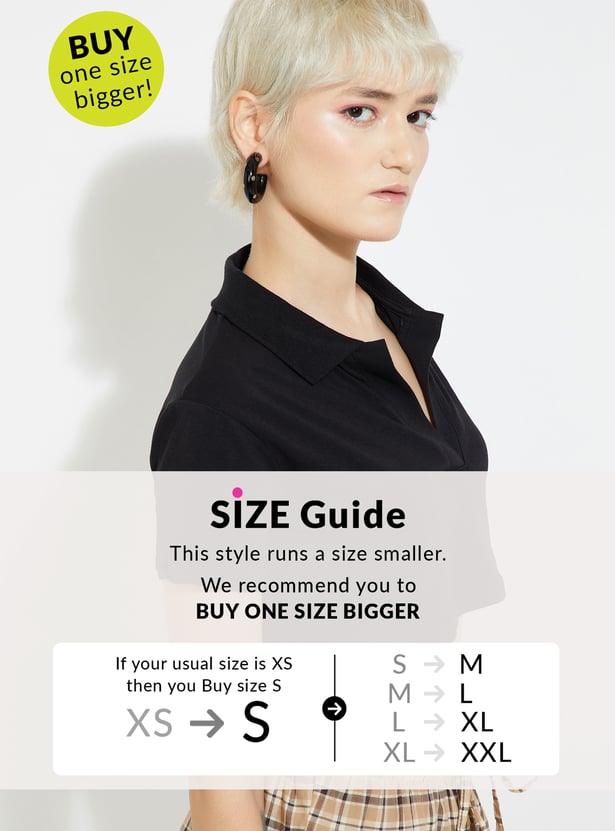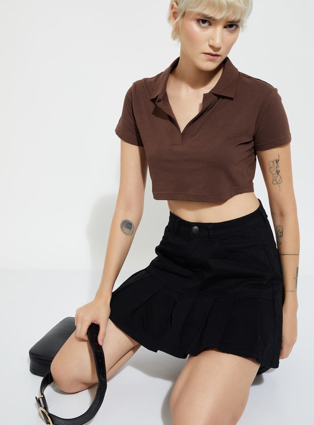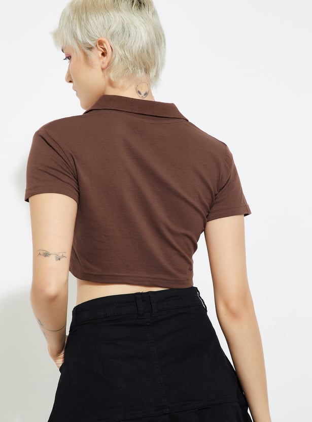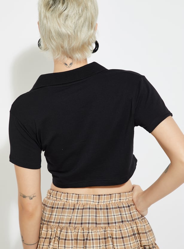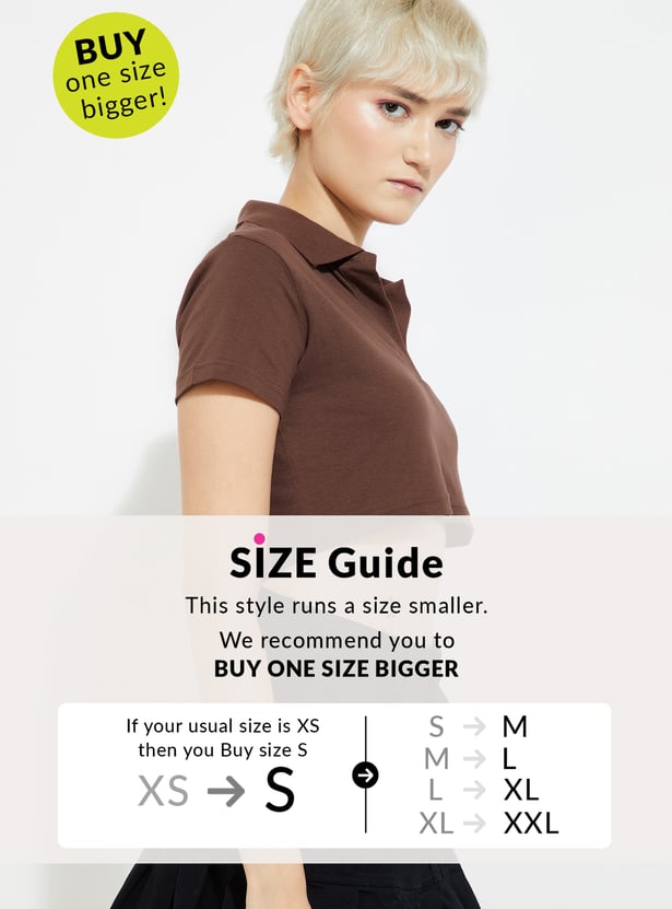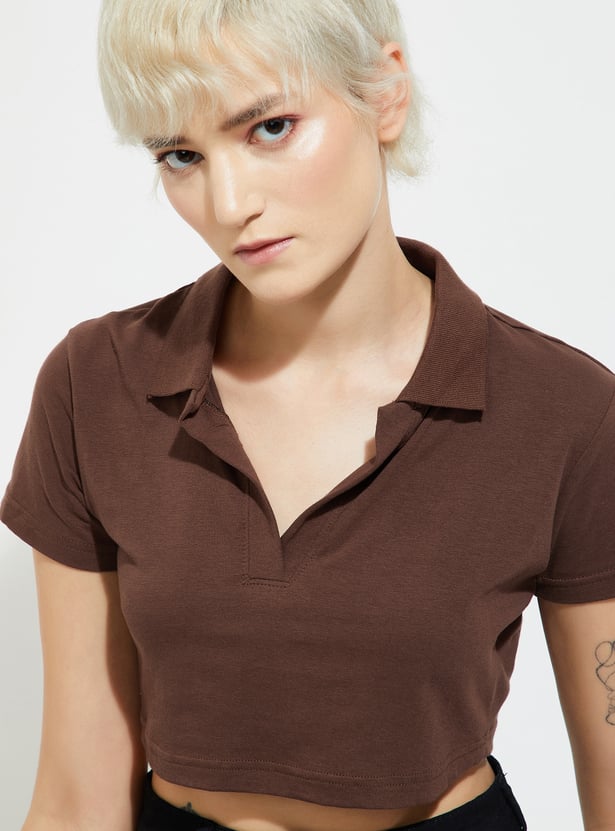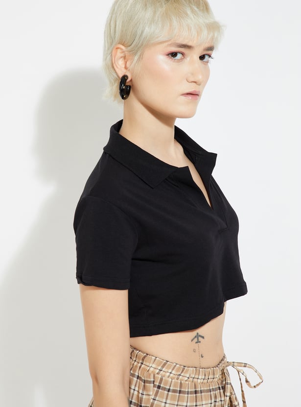 Effortlessly stylish, this solid crop T-shirt is a modern twist on a classic. Featuring a Johnny collar and half sleeves, it combines sporty charm with a chic cropped silhouette.