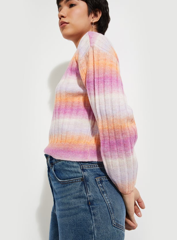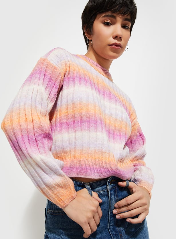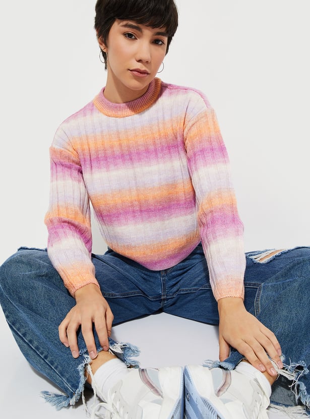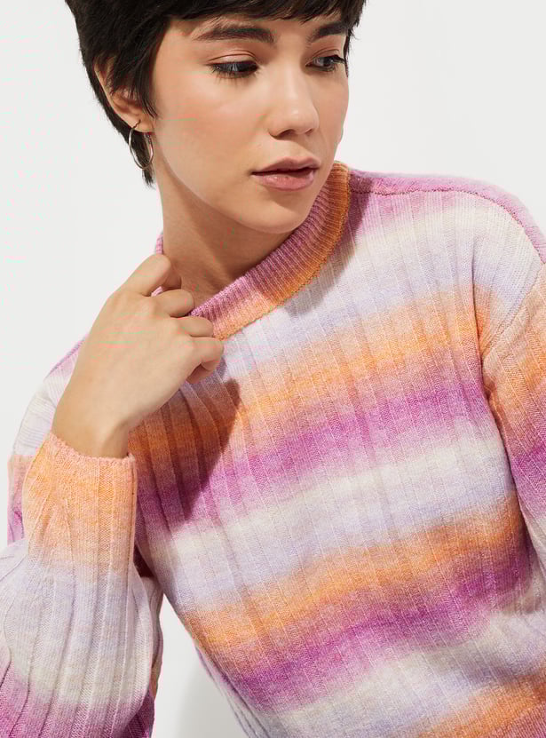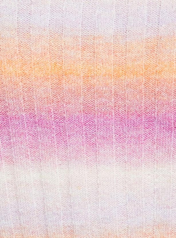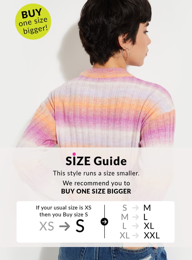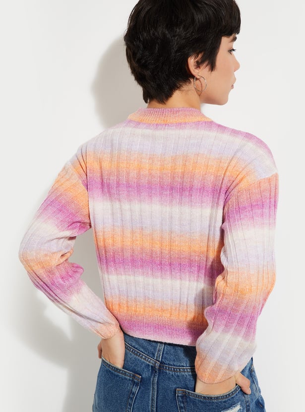 Stay warm and cute with this sweater. It is designed with a mock neck, drop shoulders, full sleeves, and ribbed trim. The striped pattern lends a vibrant look.
