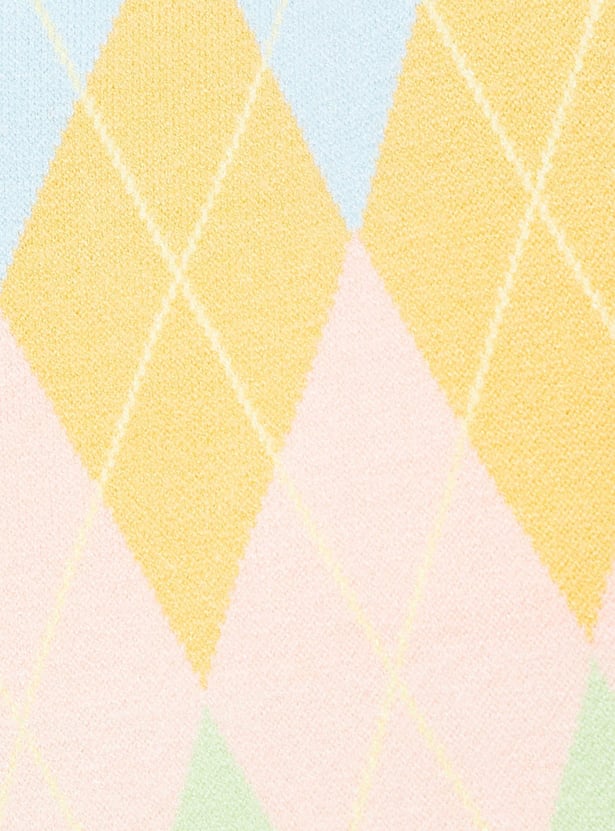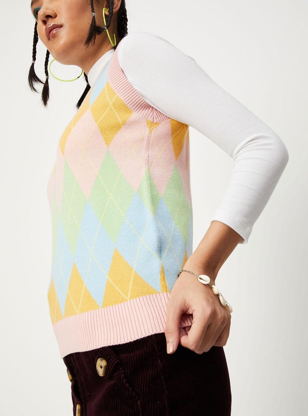 Breeze through the winter in style. This sweater has an Argyle design, V-neck, sleeveless profile, and ribbed trim.