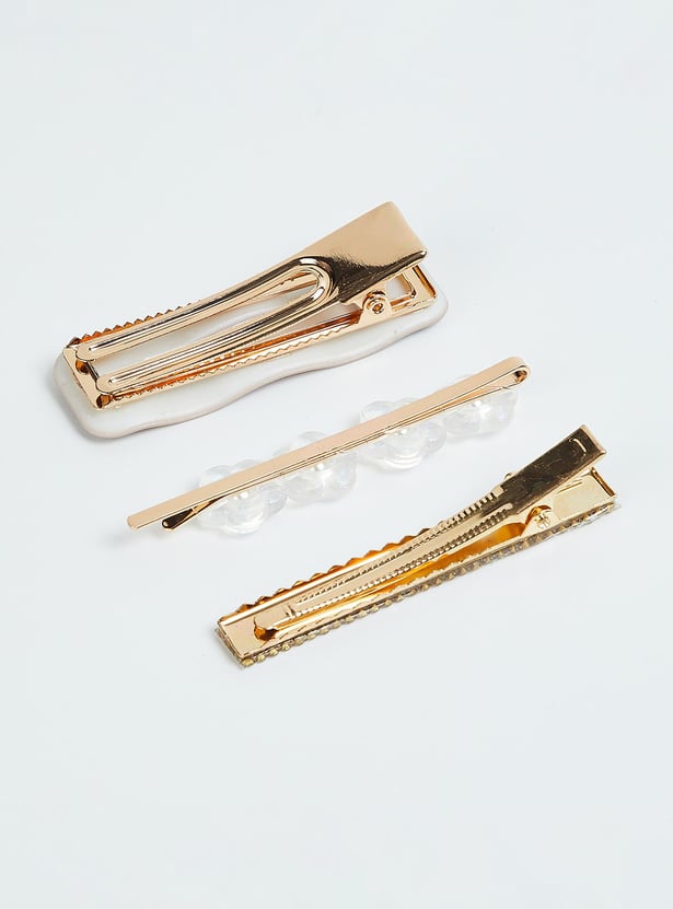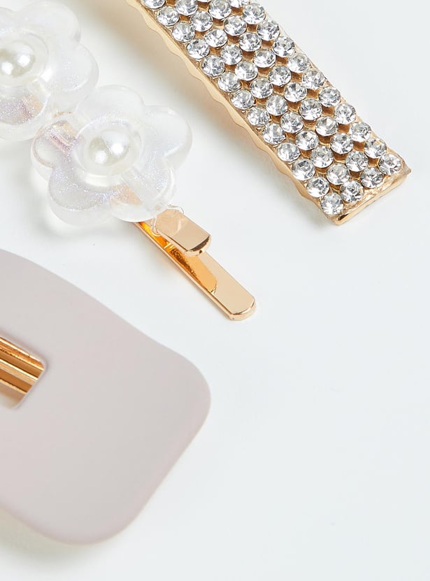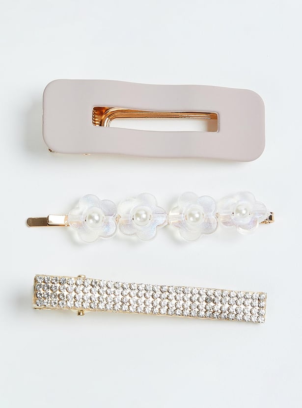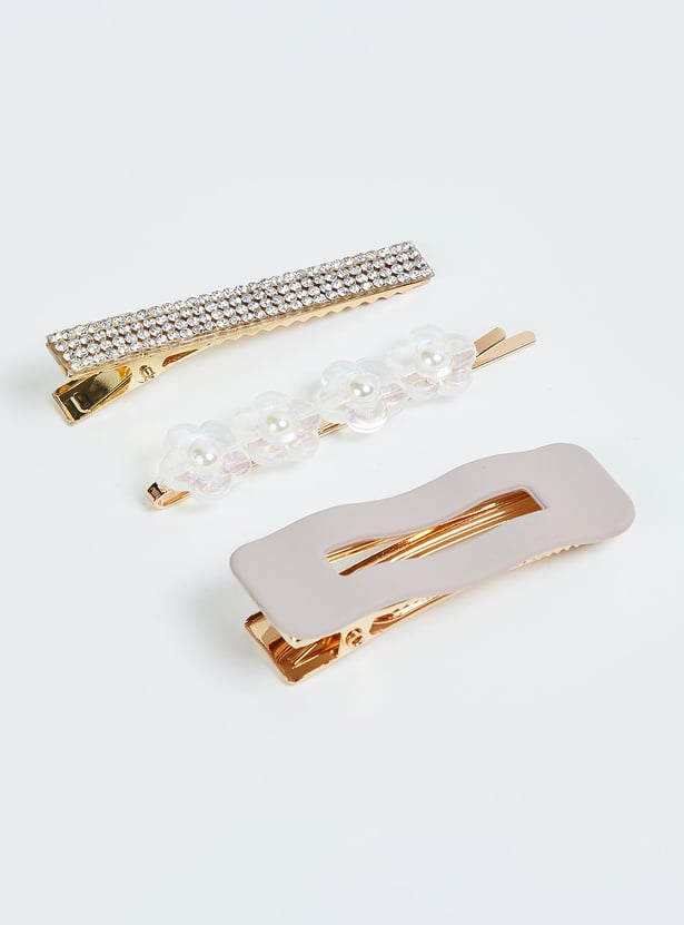 Accessorize your outfit with these hair clips to instantly elevate a boring outfit. It includes 2 clips with a narrow alligator closure to hold your hair strands in place. This pack has a solid clip with a curvy profile, a stone embellished clip, and a floral detailed bobby pin.