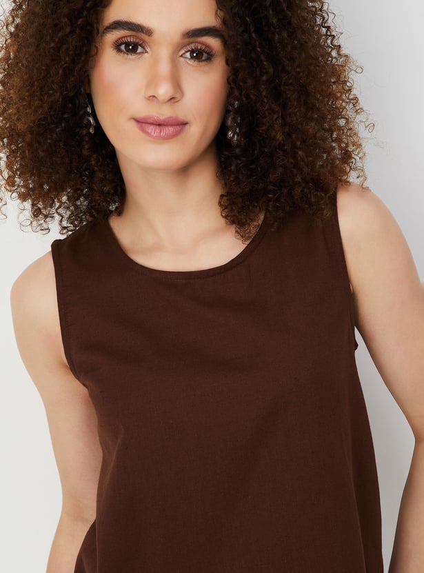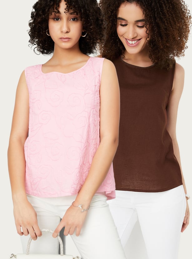 A versatile duo for your wardrobe, this pack includes one embroidered top and one solid top, both featuring a round neck and sleeveless design. Comfortable and chic, they’re perfect for casual wear or layering.