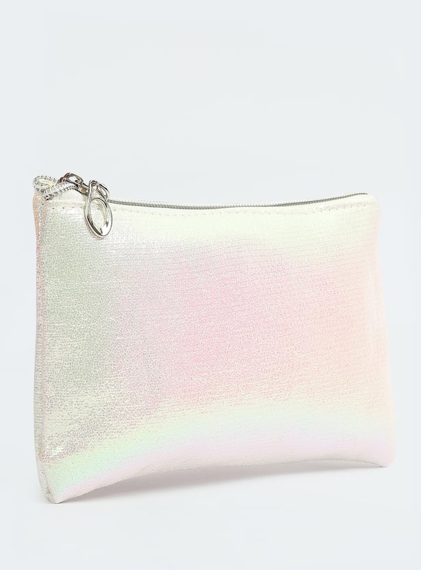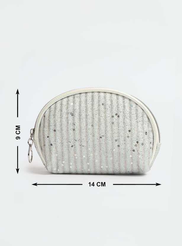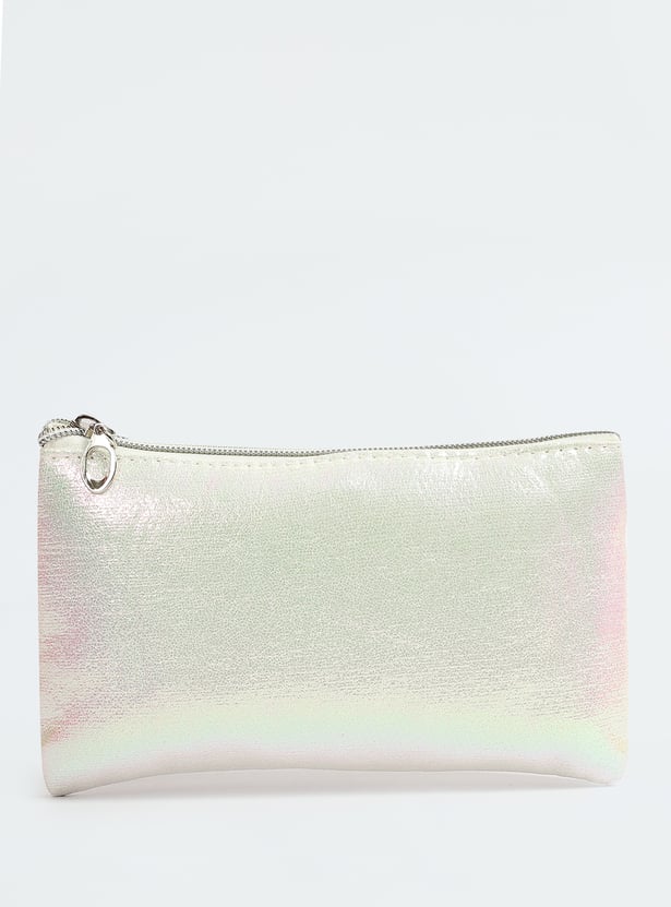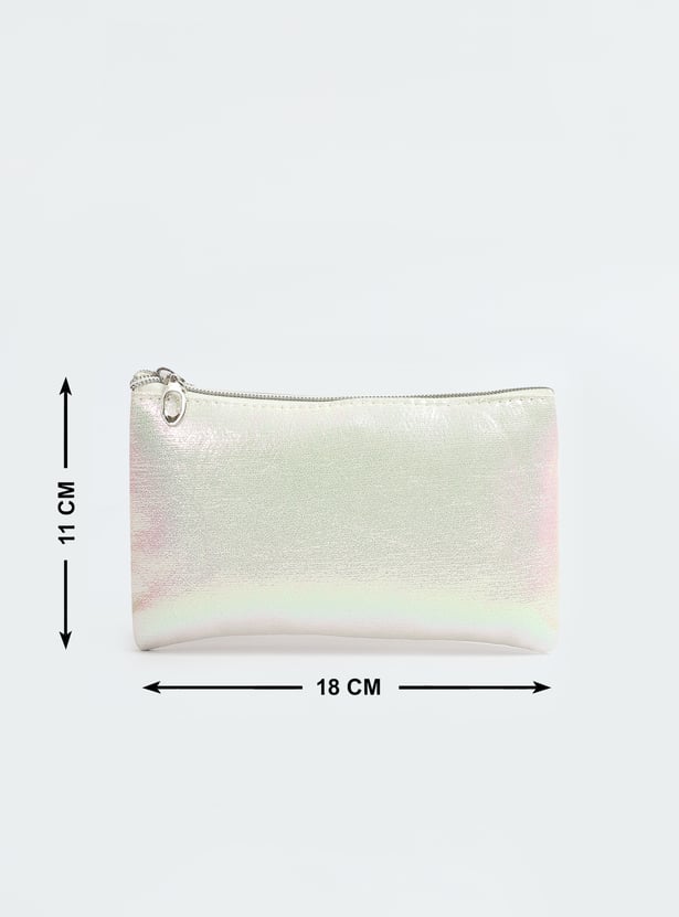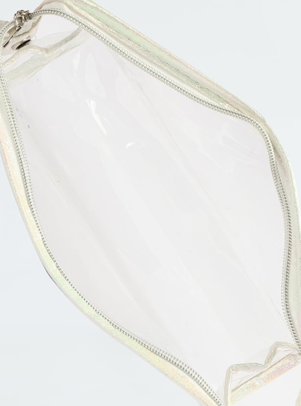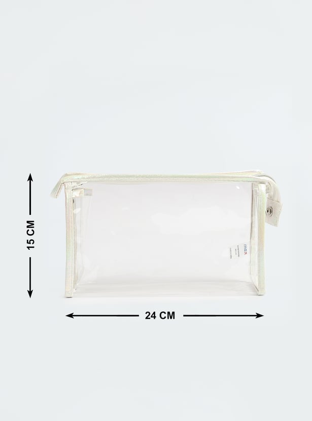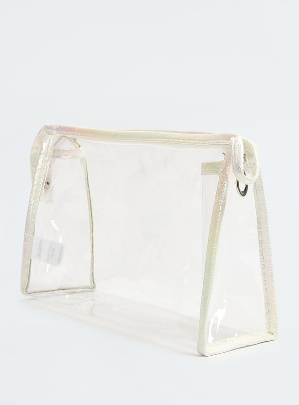 This stylish pouch set keeps you organized with three versatile options: a glittery pouch, a solid pouch, and one with a transparent exterior, all with zip closures. Perfect for storing your cosmetics, toiletries, or essentials.