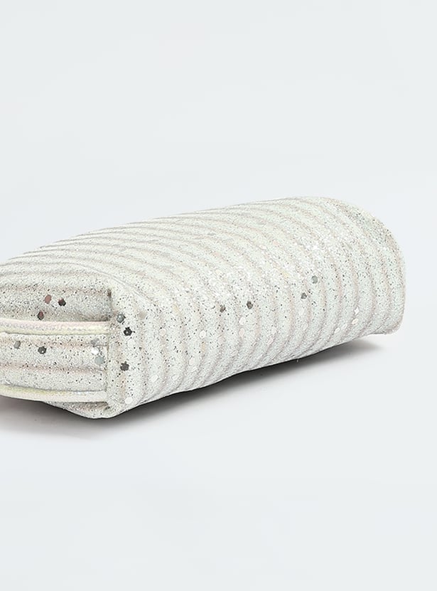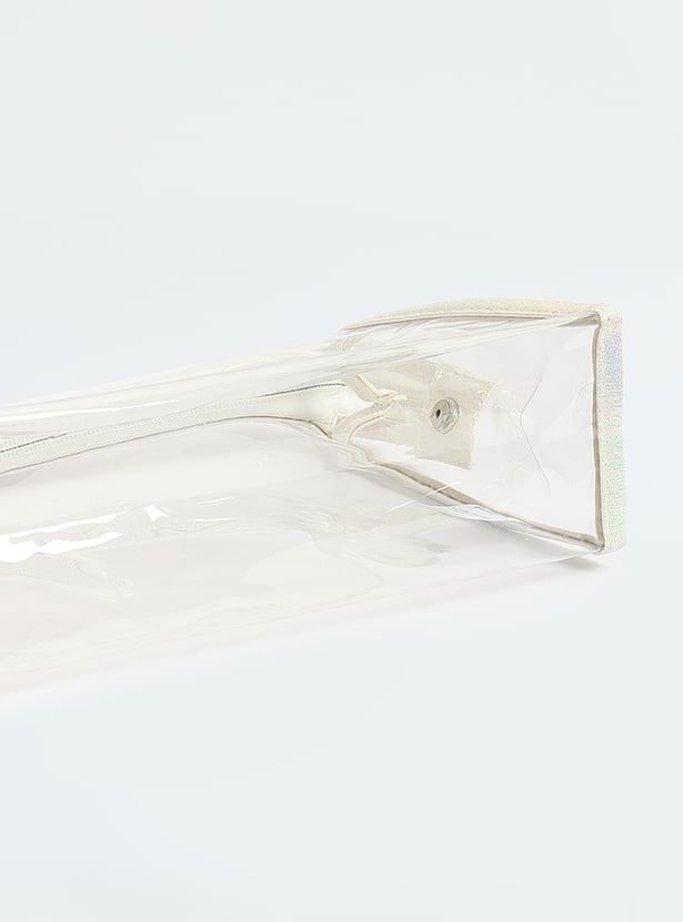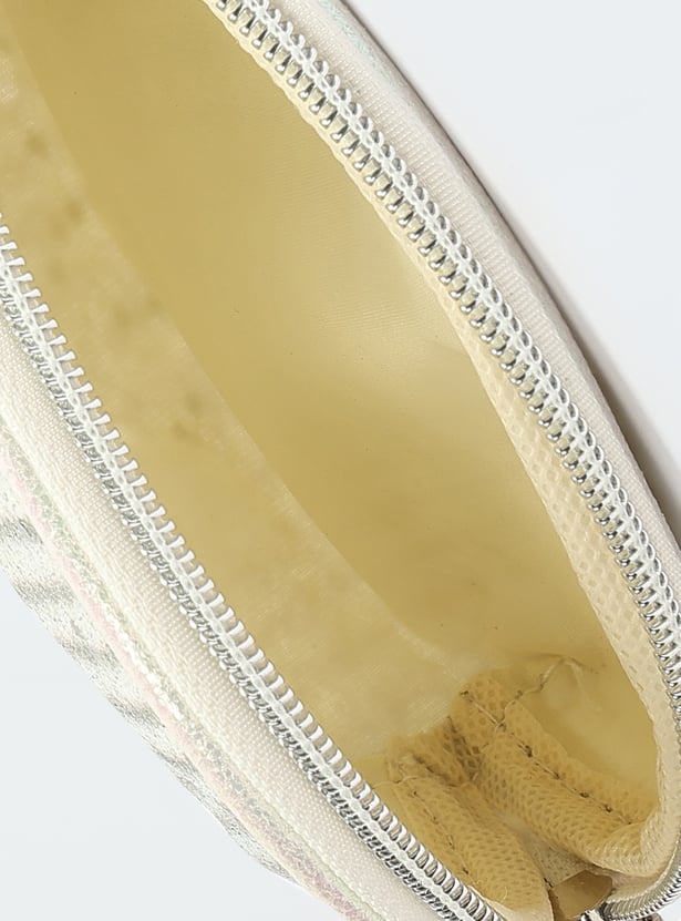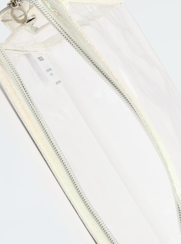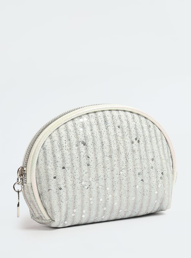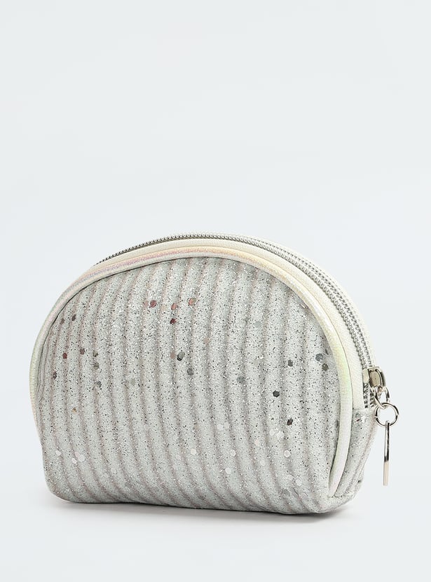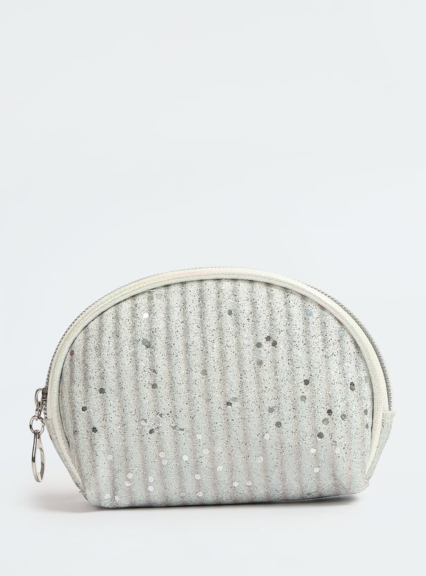 This stylish pouch set keeps you organized with three versatile options: a glittery pouch, a solid pouch, and one with a transparent exterior, all with zip closures. Perfect for storing your cosmetics, toiletries, or essentials.