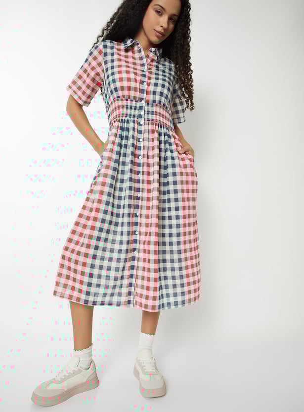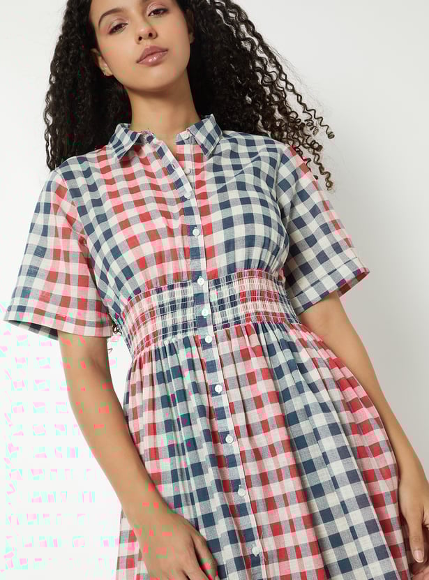 This checked A-line shirt dress features a spread collar, button-down front, and half sleeves. The smocked waist adds definition to the silhouette, blending classic charm with modern ease.