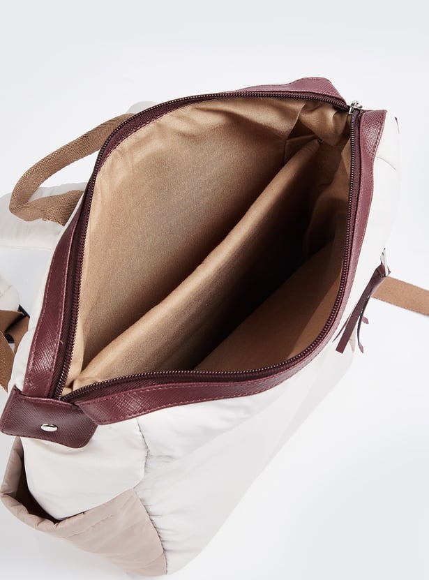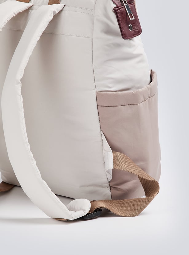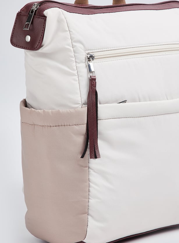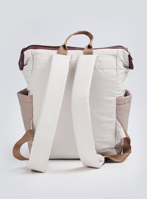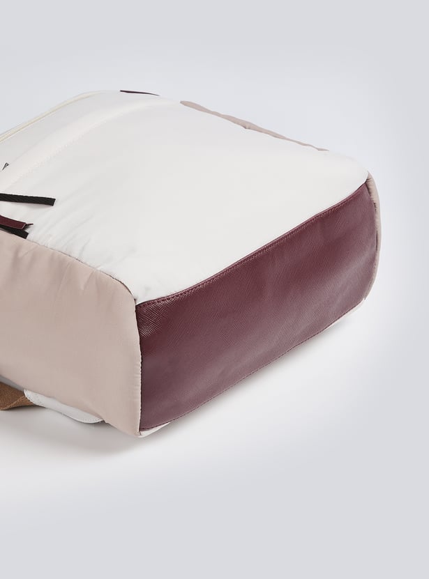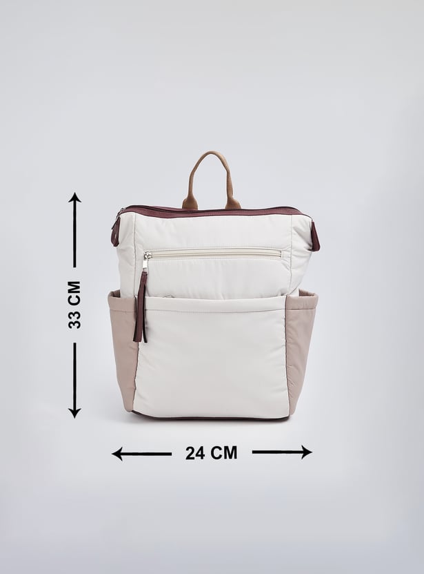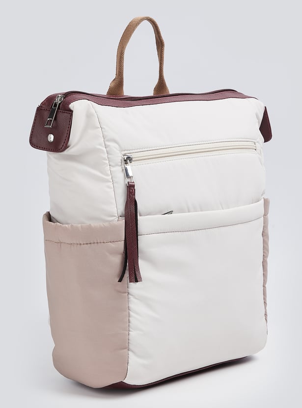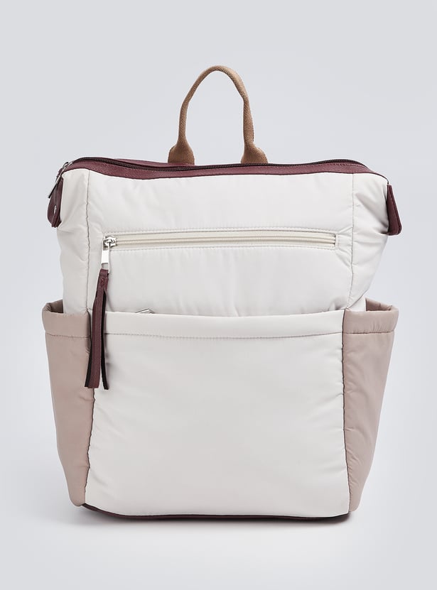 This colourblock backpack is designed with a secure zip closure, a top loop, an inner padded compartment to protect your essentials, adjustable backstraps for comfort, side stash pockets for quick access, and front pockets for added storage.