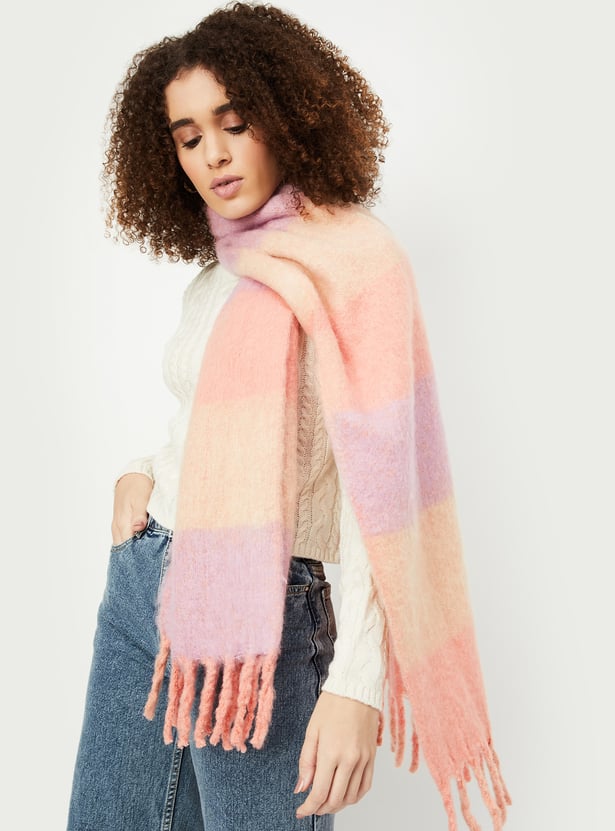 Elevate your winter style with this cosy muffler. Featuring a plush colourblocked design and finished with a tassel hem, it brings both warmth and flair to your wardrobe, making it the perfect accessory for those chilly days.