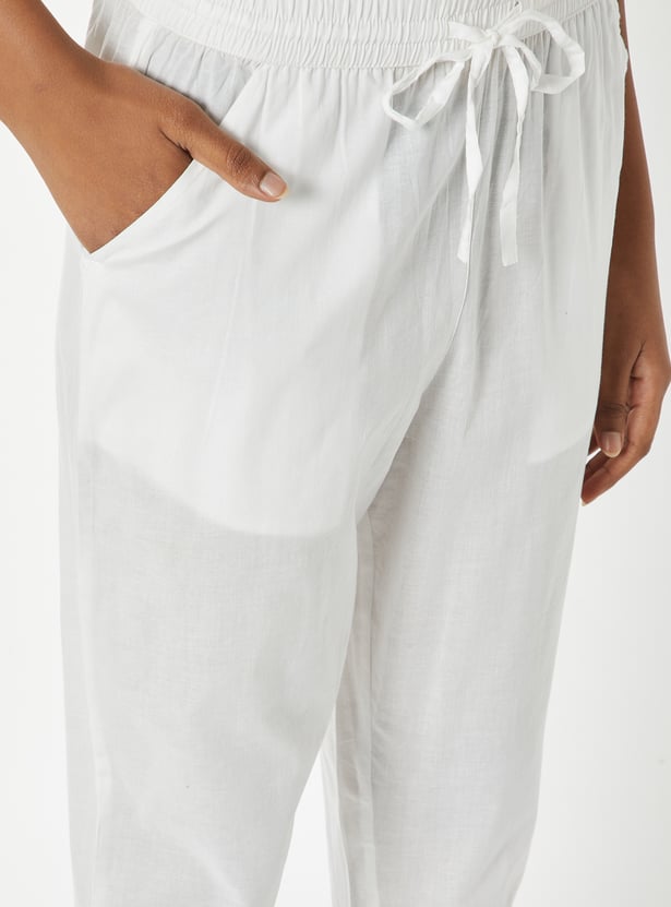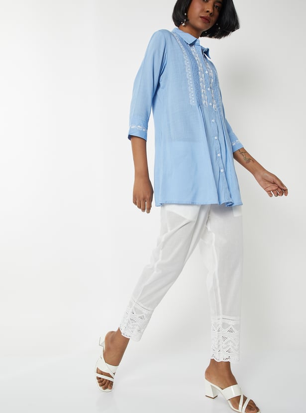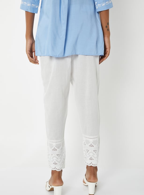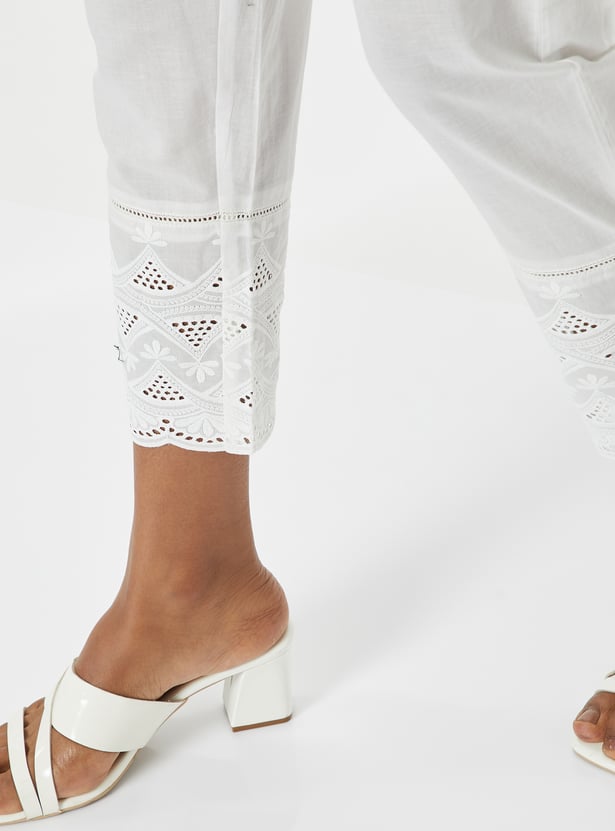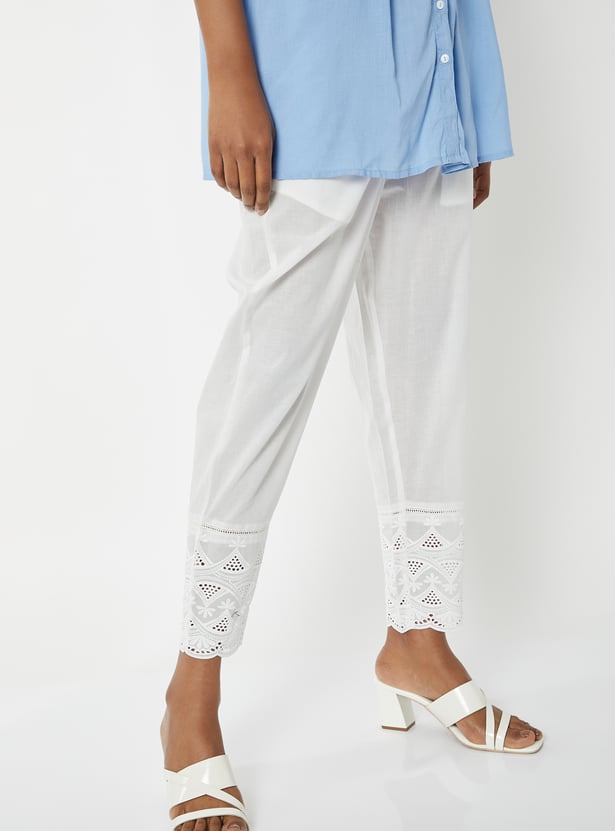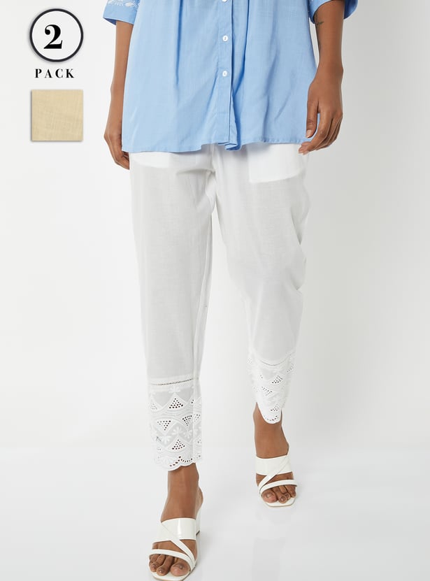 Elevate your everyday look with this duo of embroidered straight pants. Designed with an elasticated waistband and adjustable drawstring for a perfect fit, they feature functional pockets and a chic scalloped hem that adds a touch of elegance.