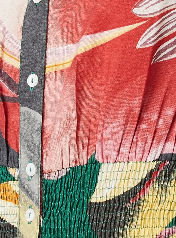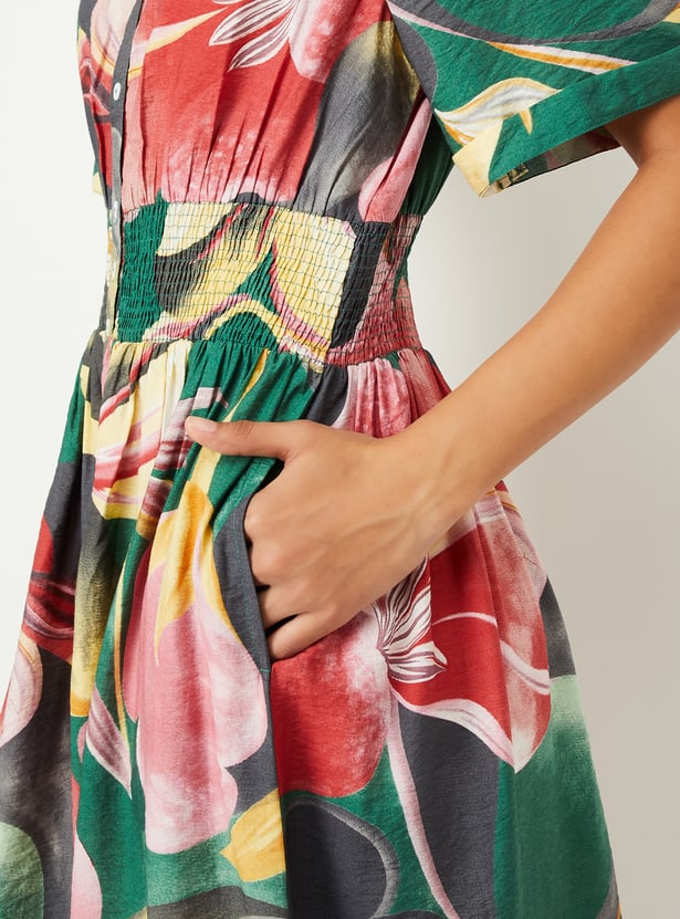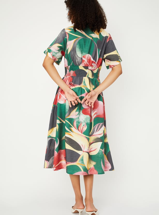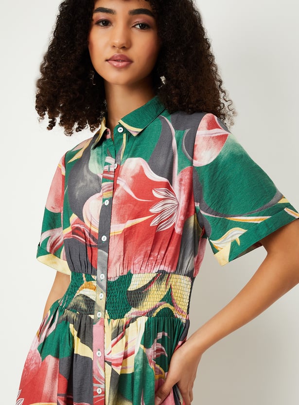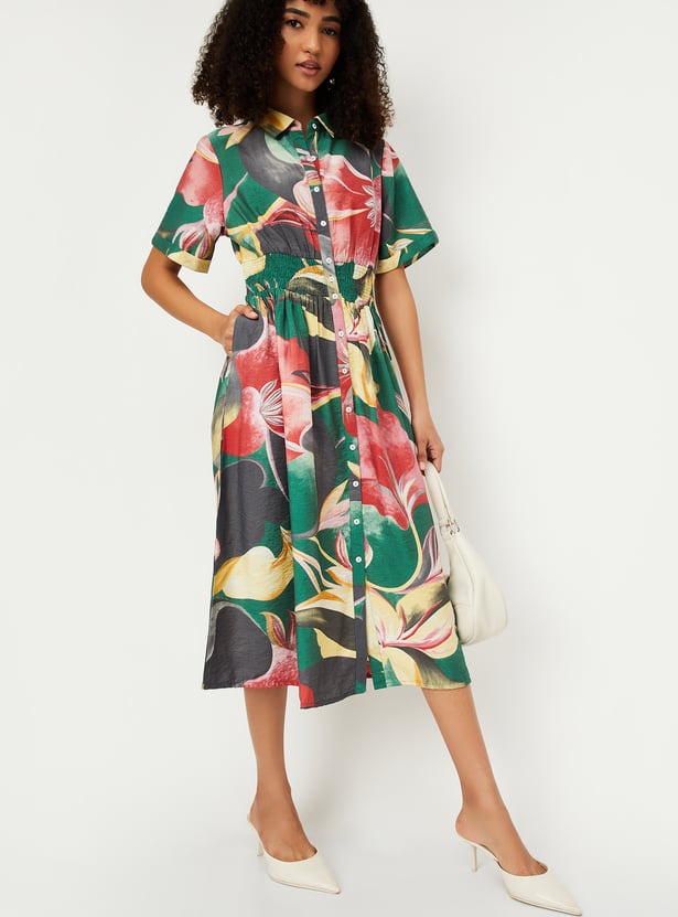 Step into effortless elegance with this floral print A-line dress. Featuring a spread collar, button placket, half sleeves, and a flattering midi length, it’s perfect for both casual and semi-formal occasions.