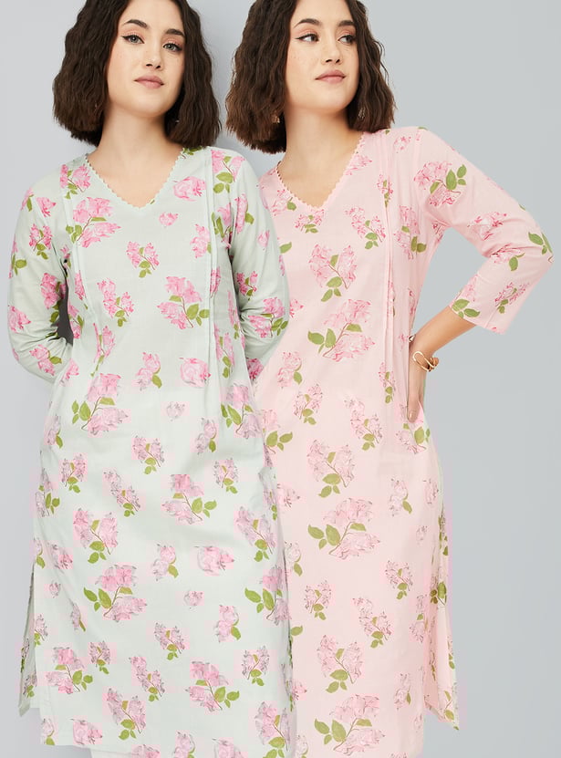 This pack of two floral printed kurtas features a V-neckline, 3/4th sleeves, and a functional side pocket for everyday comfort. Delicate pleated detailing along the shoulder adds soft structure and visual interest.
