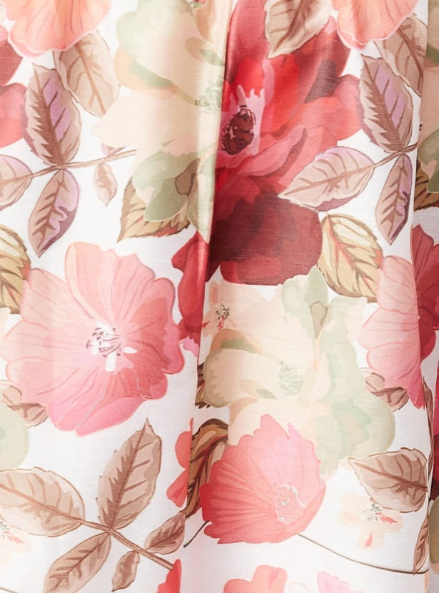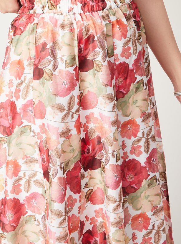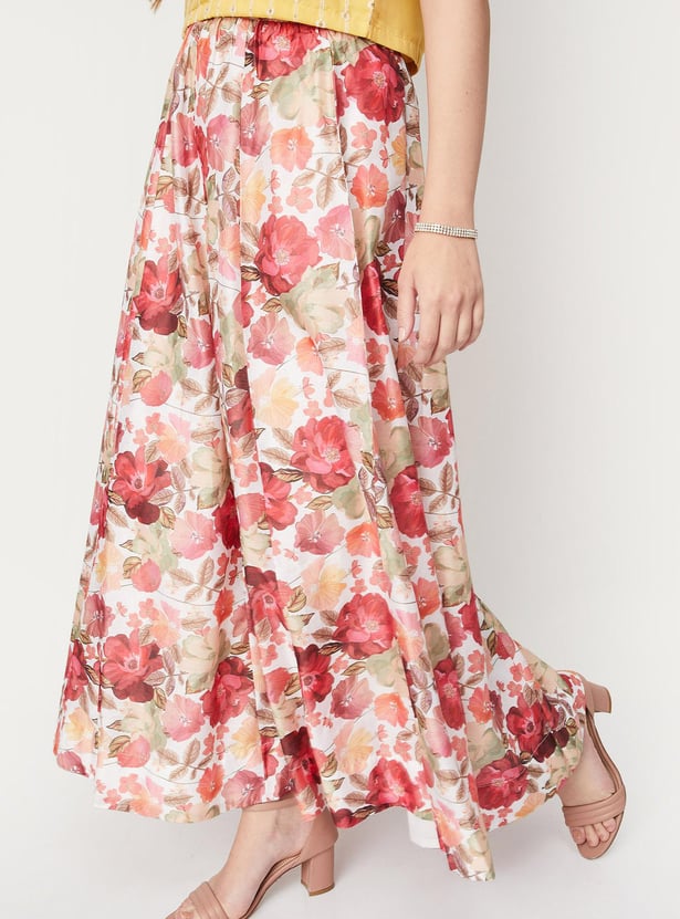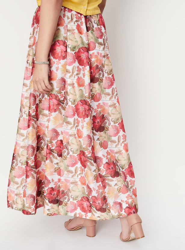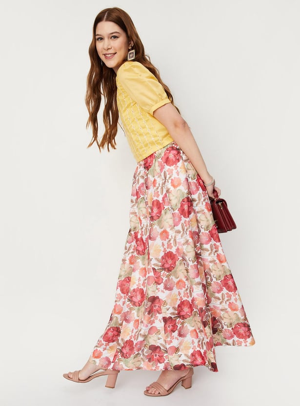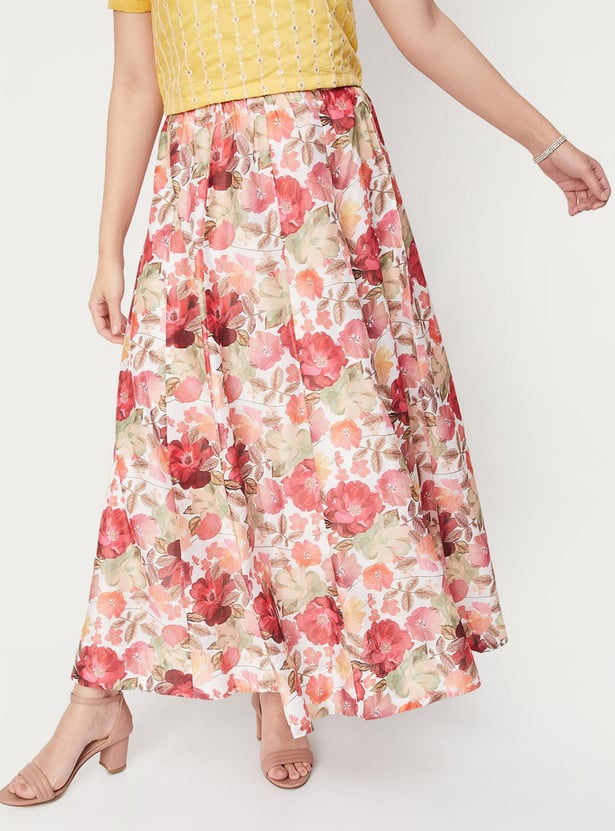 Breeze through the day in style. This maxi-length skirt is styled with floral prints, an elasticated waist, pleated detailing, and an A-line profile. Style this skirt with a top and block heels for a chic look.