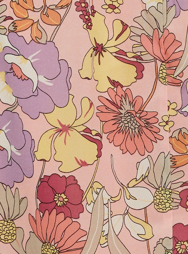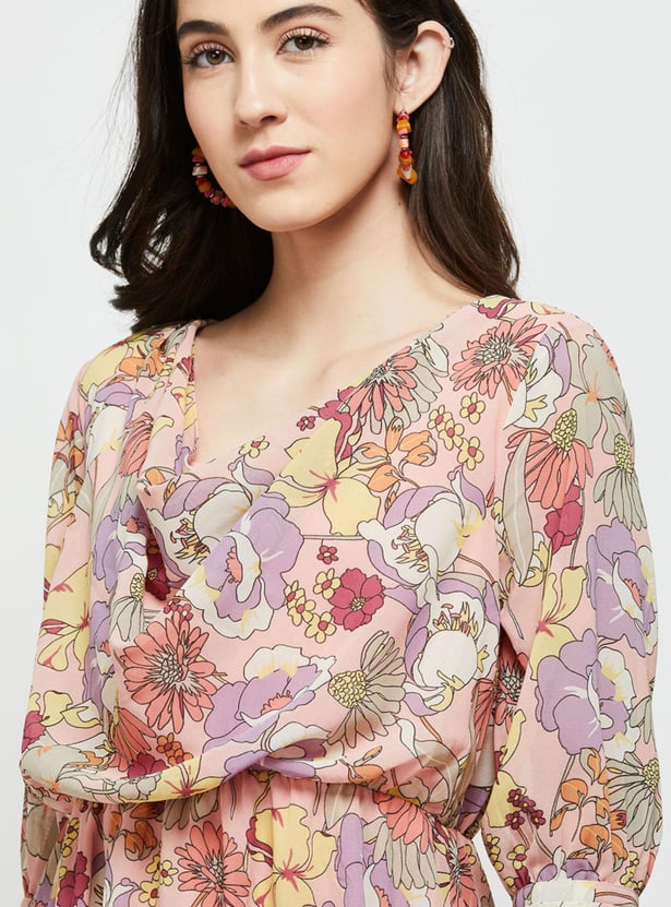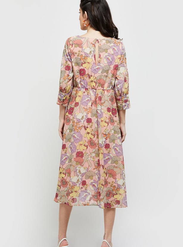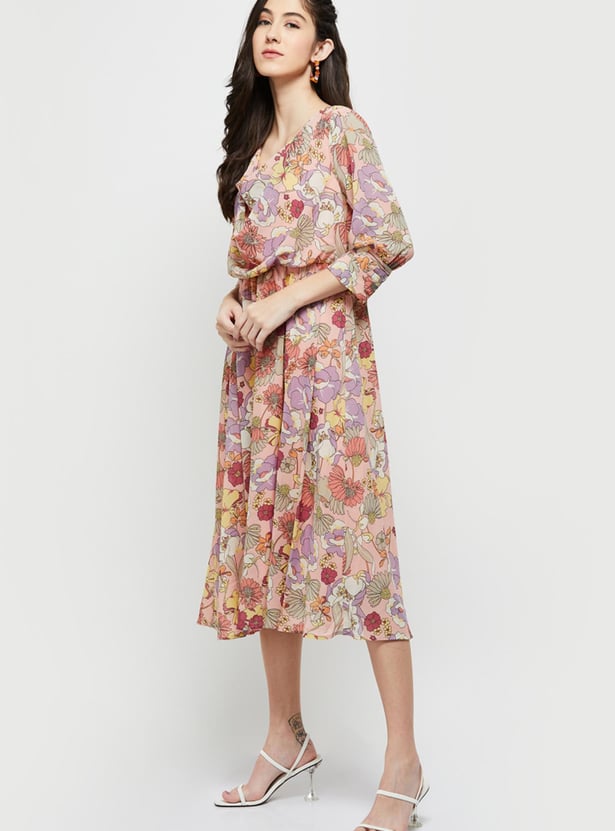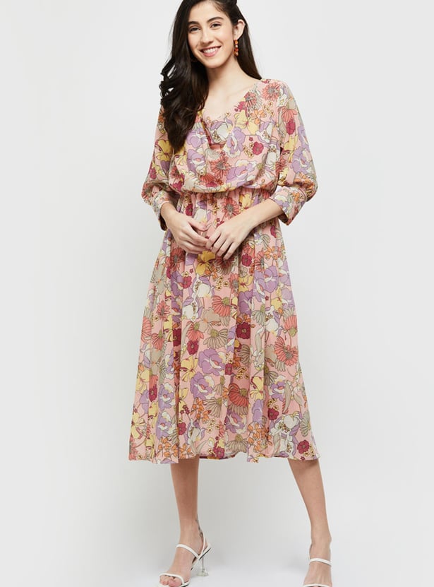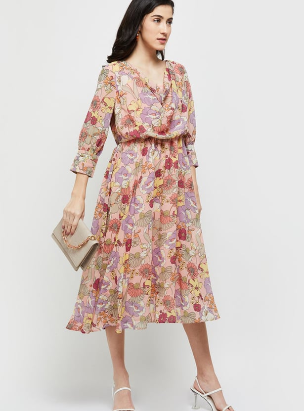 Look chic in this midi-length dress featuring floral prints, a cowl neckline, three-quarter sleeves, and a pleated waist. For a spring-inspired look, pair this dress with open sandals and a sling bag.