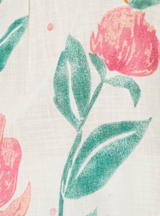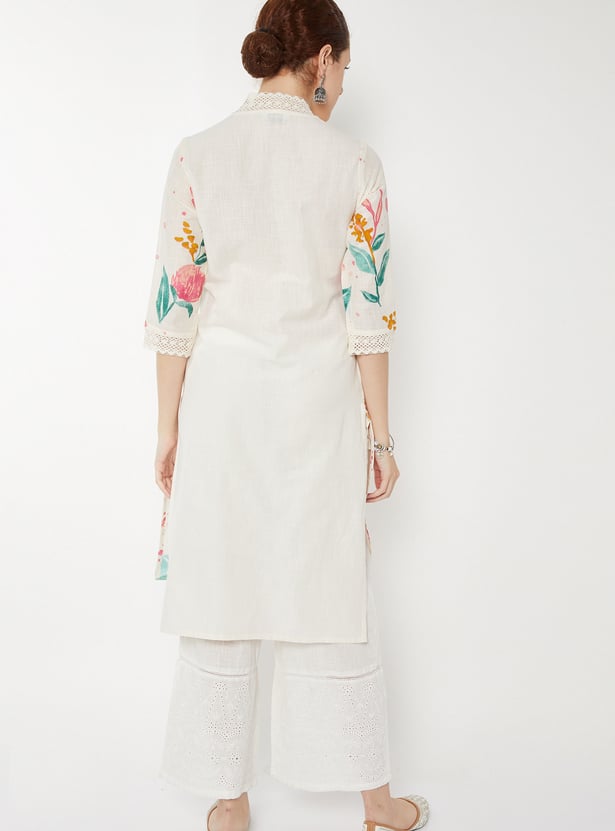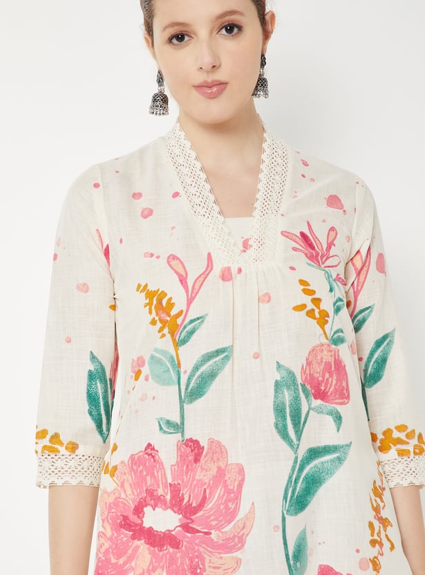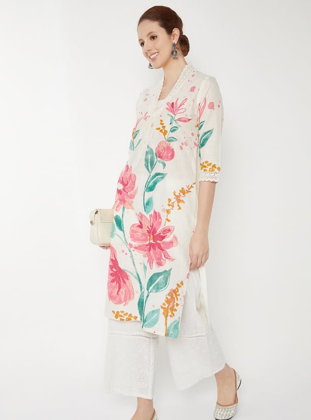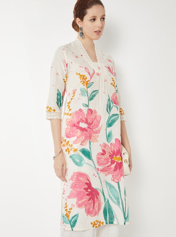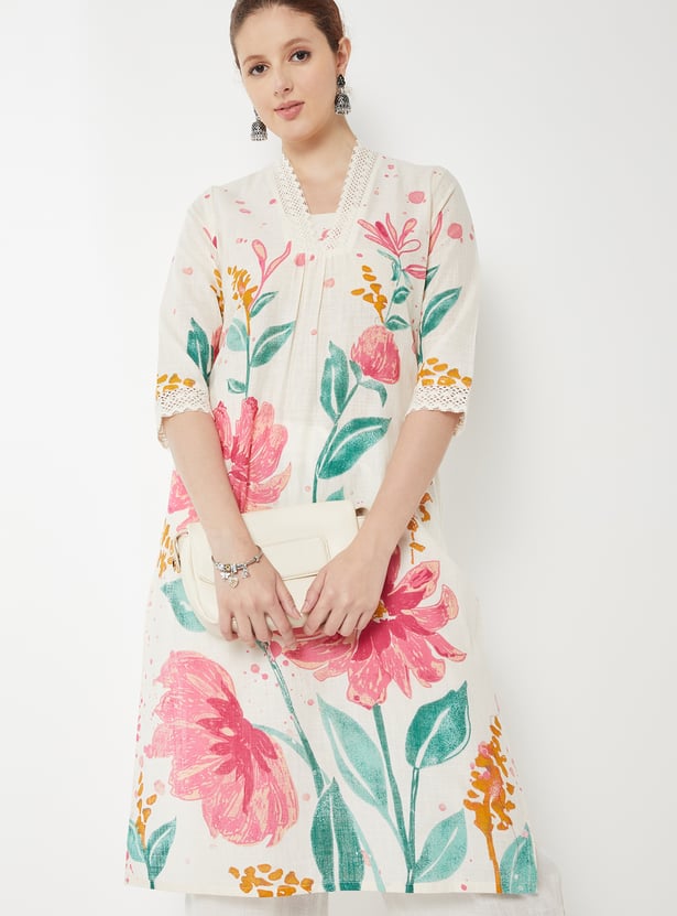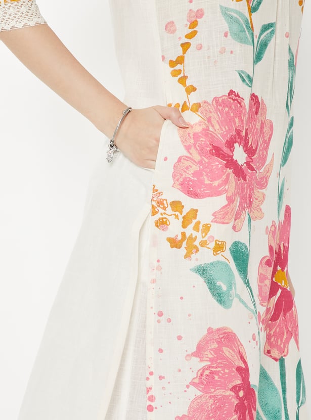 Designed with three-quarter sleeves, a stylised neck, and a calf-length silhouette, this floral printed kurta is a wardrobe essential.