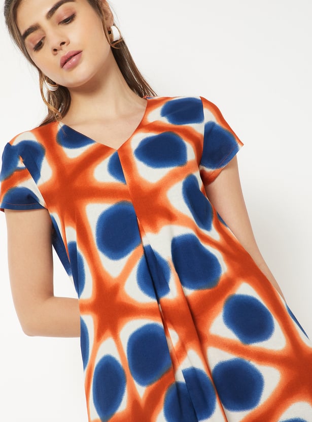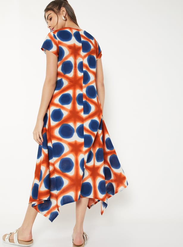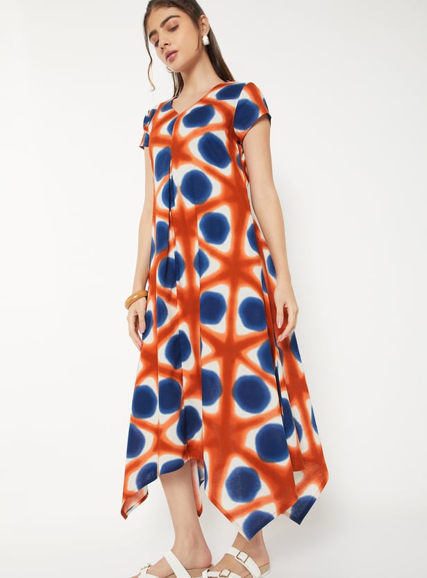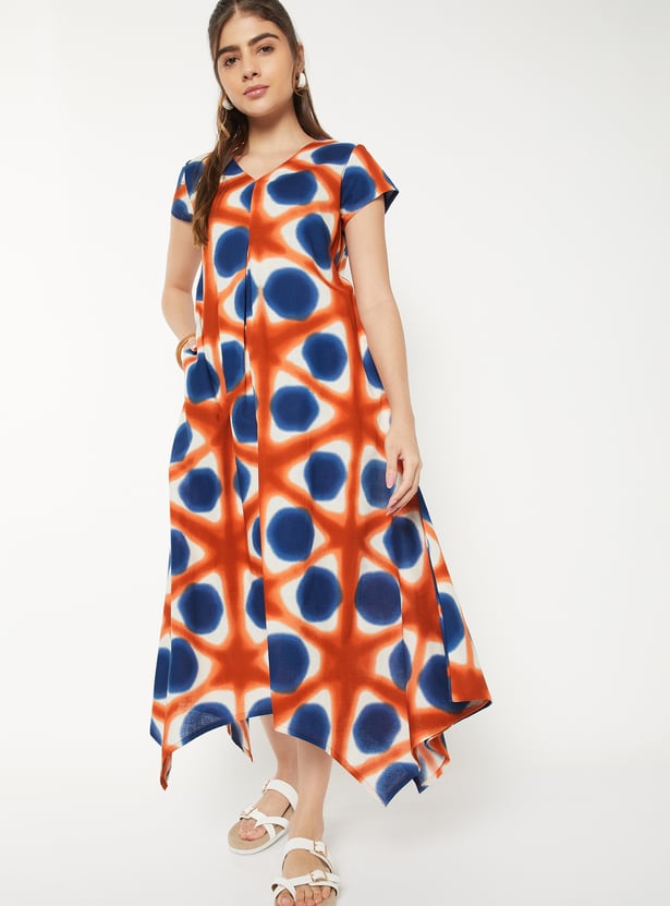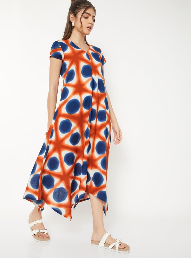 Step out in effortless style with this printed A-line dress, designed with a flattering V-neck and comfortable half sleeves. The asymmetrical hem adds a modern twist, enhancing its flowy and feminine silhouette.