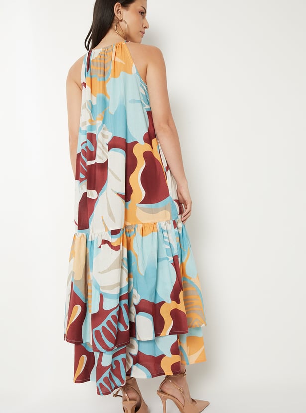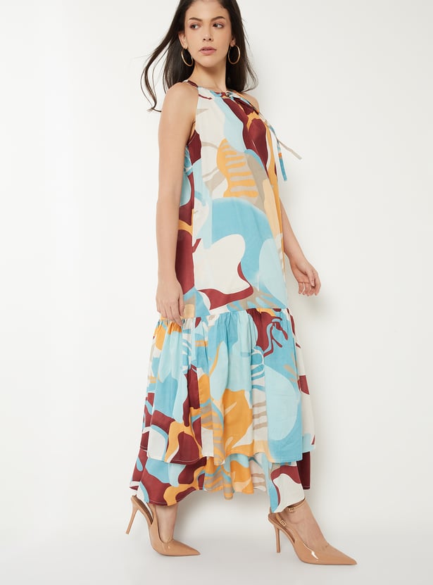 Feminine and playful, this printed A-line maxi dress is designed with shoulder straps, a halter neck, side pockets, and a layered hem for added movement and charm. The flared silhouette ensures comfort while the print brings a lively touch, making it perfect for casual outings or daytime events.