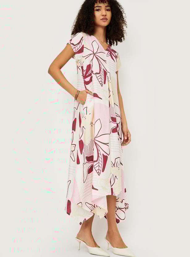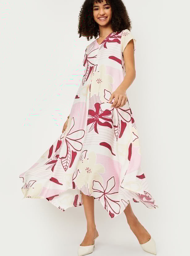 Make a graceful statement in this printed A-line midi dress. Featuring a flattering V-neck, half sleeves, and an eye-catching asymmetric hem, it combines flowy elegance with contemporary flair.