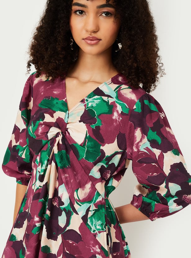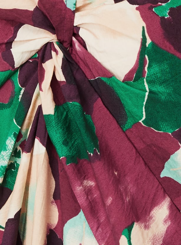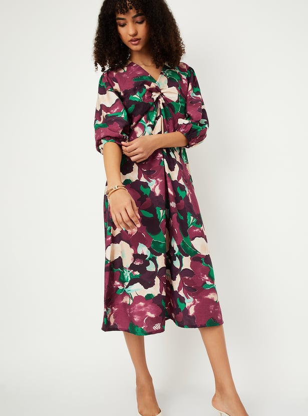 Make a stylish statement with this printed knot detail a-line dress. Featuring a flattering V-neck, 3/4th sleeves, and a midi length, it’s designed with a knot detail and convenient side pockets for added charm and functionality.