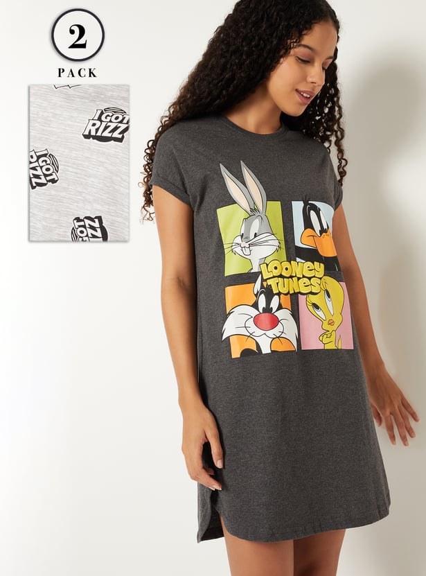 A pack of two printed chemises styled with a round neck, half sleeves, and a knee-length profile for relaxed wear. The easy fit and playful prints make this set ideal for bedtime comfort, lounging, and all-day indoor wear.