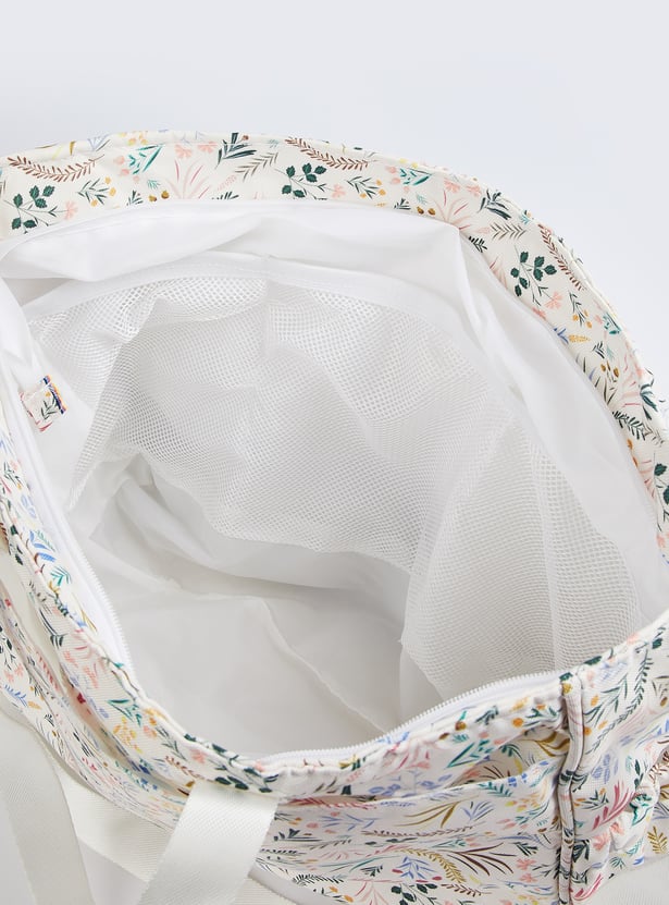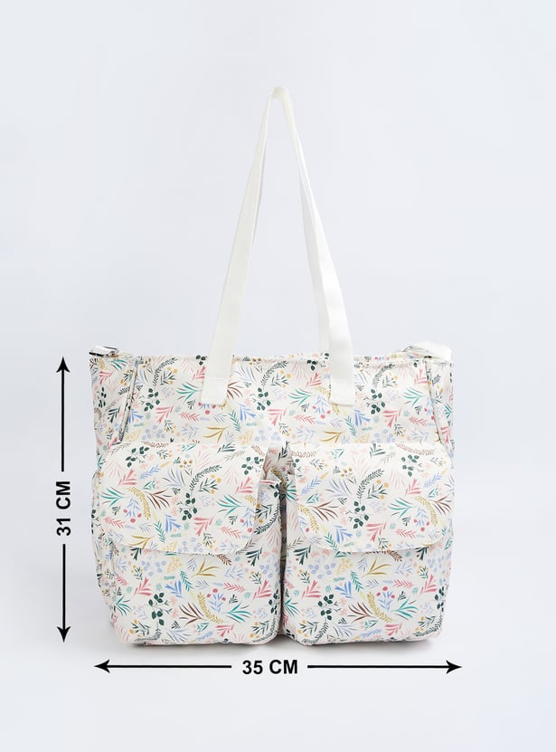 This printed diaper bag features twin handles and zip closure, front pockets for easy access, and comes with a convenient changing mat. Stylish and functional, it's designed to keep all your baby essentials organized while on the go.