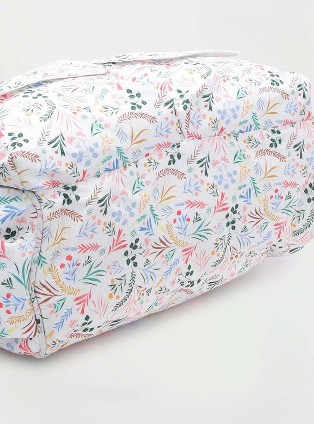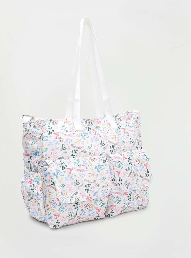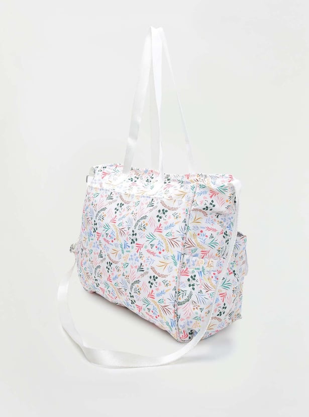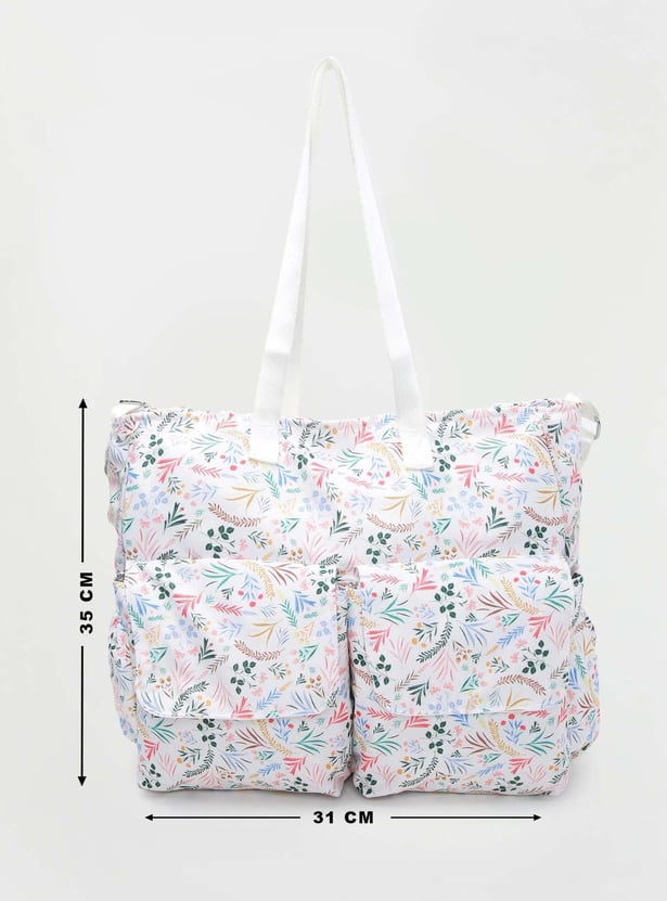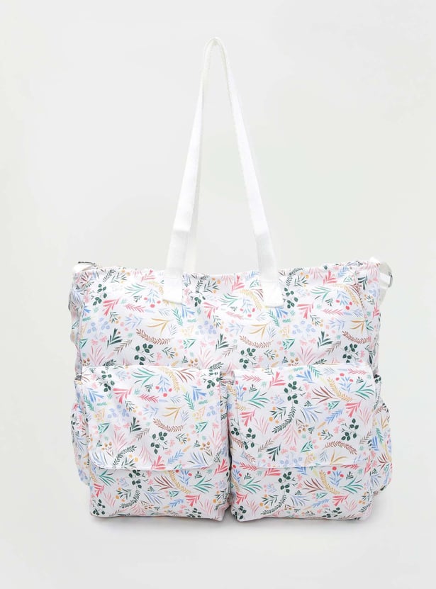 Designed for travelling with infants, this diaper bag features all-over floral prints, flat handles, a convenient strap, front flap pockets, and an interior pocket.