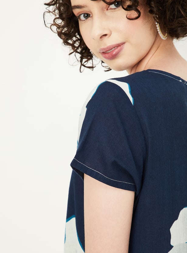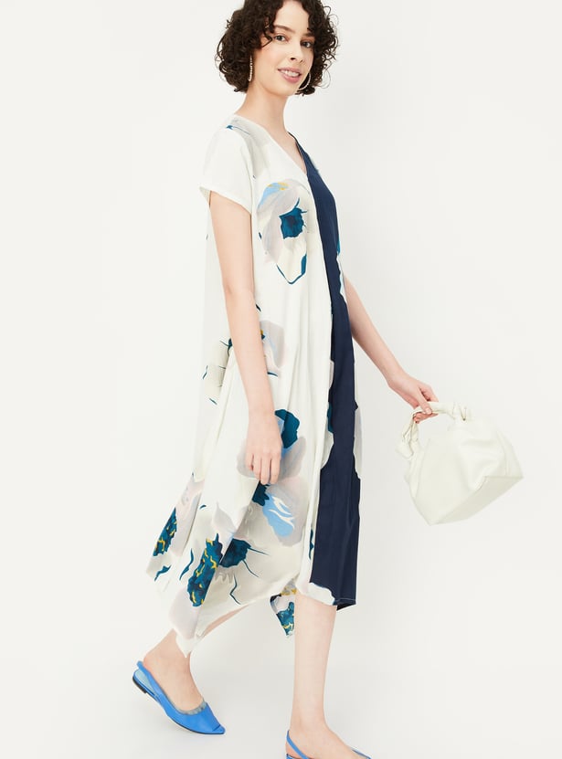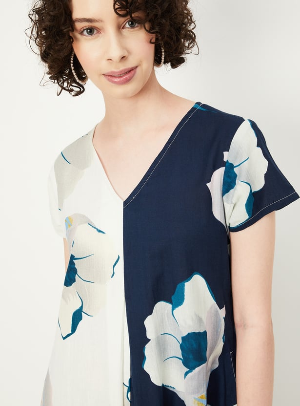 Brighten up your summer wardrobe with this stunning printed dress. Boasting a V-neck, half sleeves, and a stylish handkerchief hemline, it effortlessly radiates both style and charm.