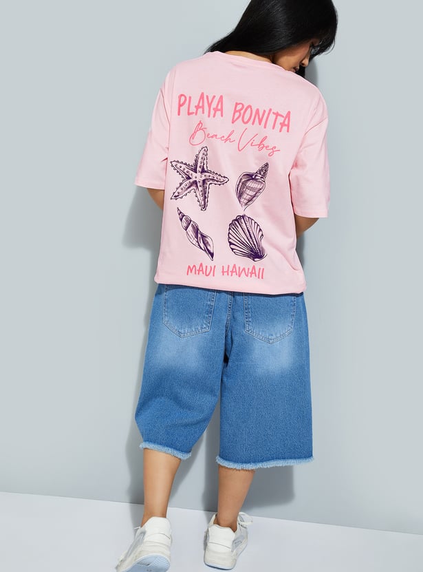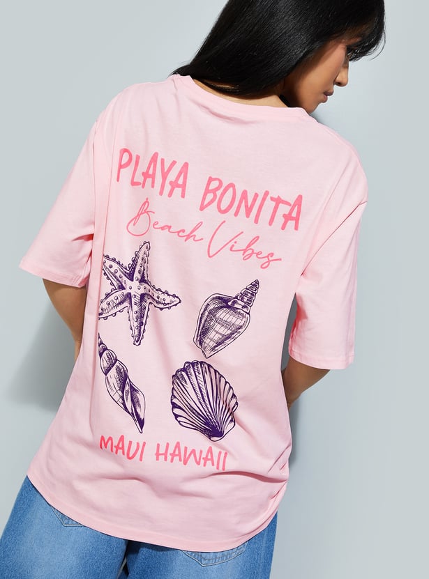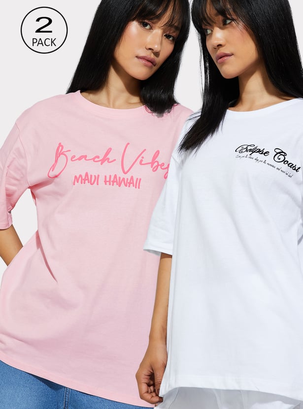 This pack includes two women’s oversized T-shirts featuring stylish graphic prints that add a playful and trendy vibe to your everyday wardrobe. The T-shirts are designed with a round neckline and half sleeves, offering a relaxed fit and lasting comfort for daily wear.