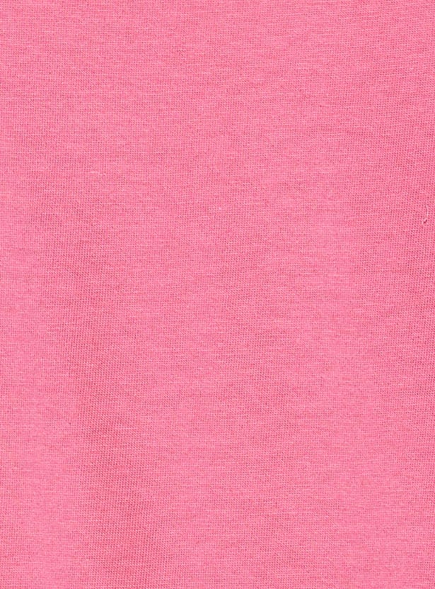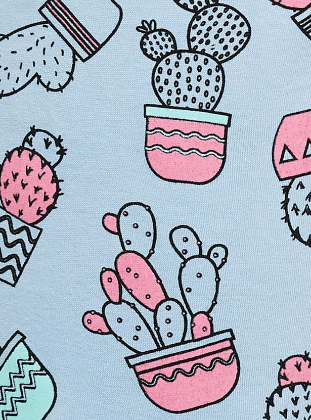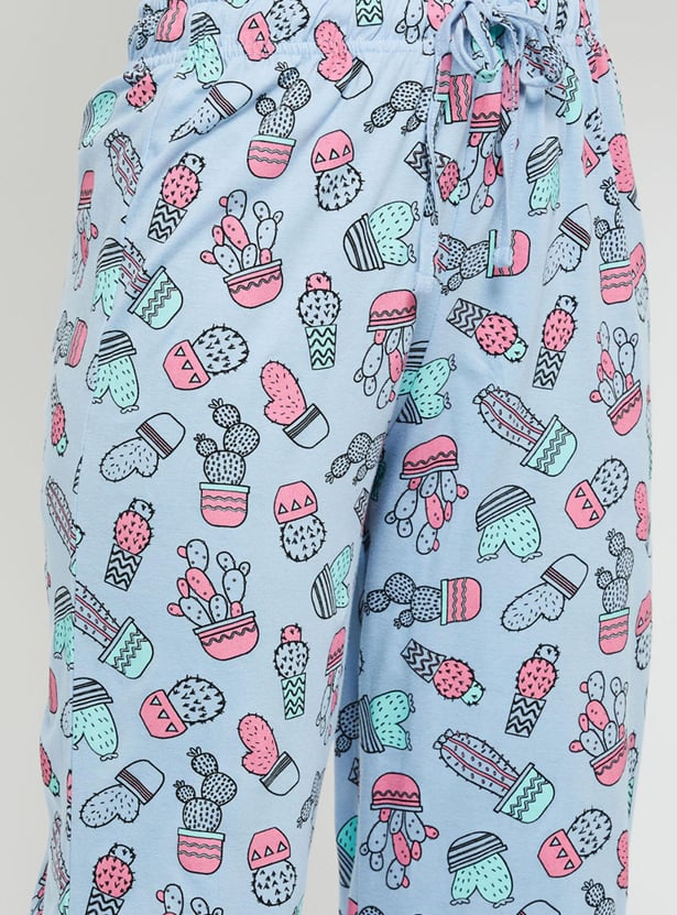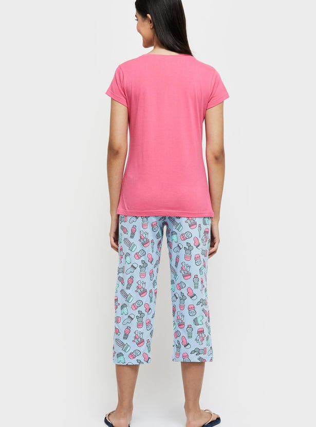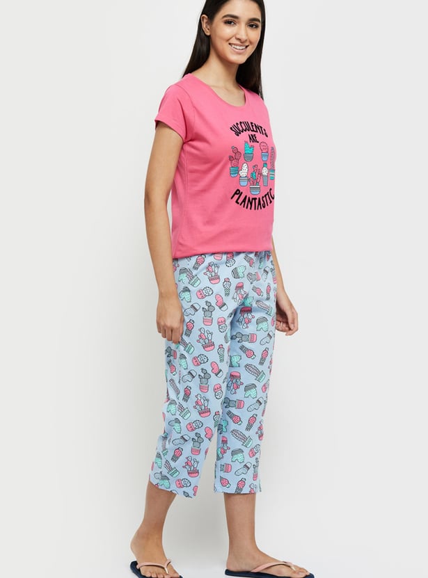 Designed with graphic prints, this set features a round-neck tee and a pair of elasticated capris. Be it while enjoying your favorite movie or hitting the bed after a tiring day, this cozy set always makes for a comfortable ensemble.