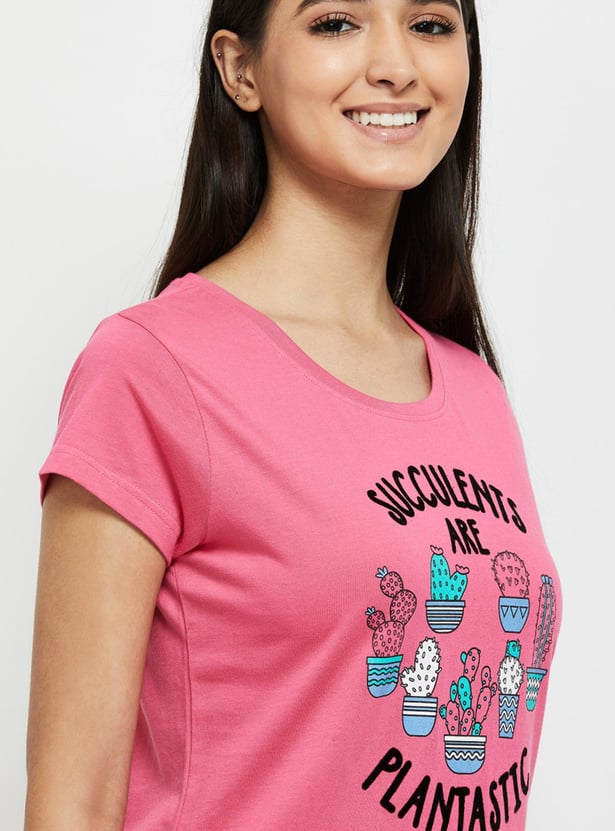 Women Printed Round Neck T-shirt with Elasticated Capris