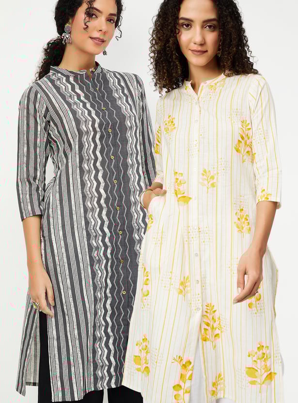 This pack of two printed straight kurtas features two distinct prints, each designed with a band collar, button-down front detailing, and 3/4th sleeves. The calf-length silhouette is finished with a functional side pocket for everyday ease.