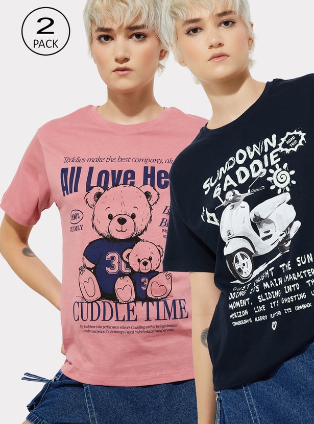 This pack includes two women’s T-shirts designed with playful printed patterns that add a stylish touch to your everyday wardrobe. Each T-shirt features a classic round neckline and half sleeves, offering comfort and versatility for daily wear.