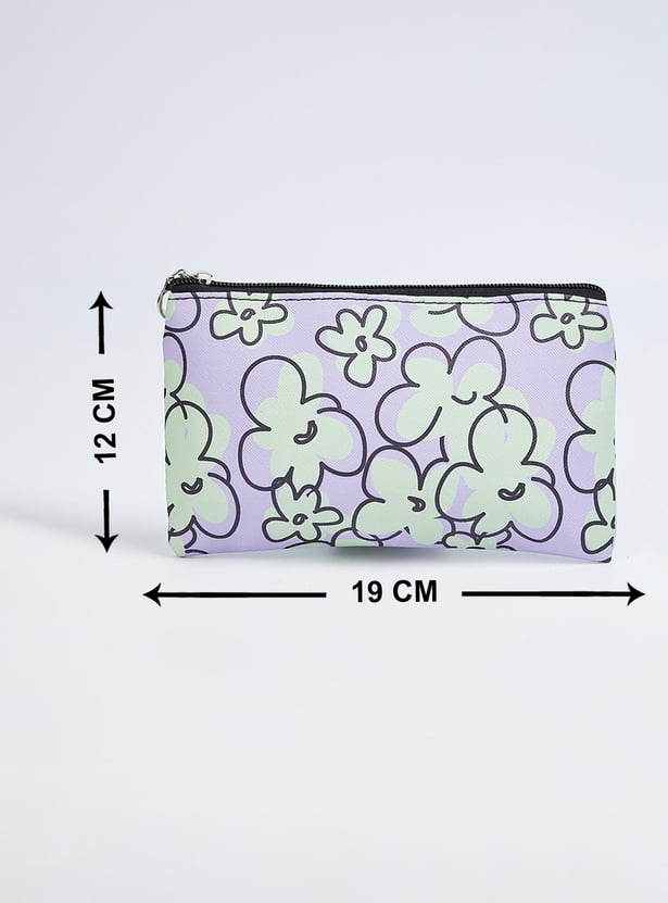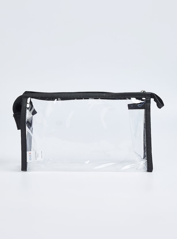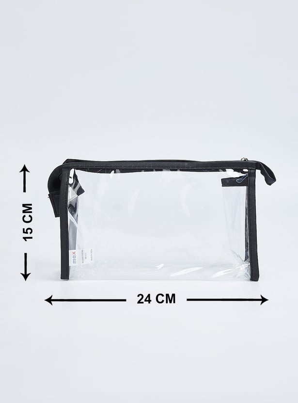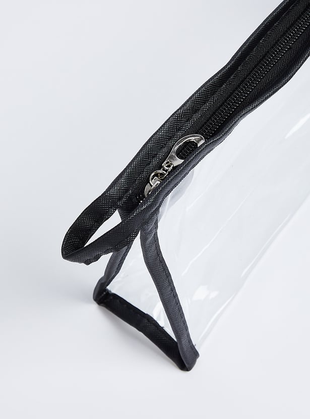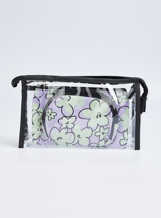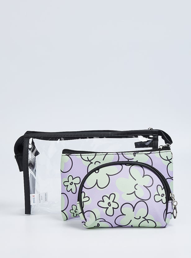 Keep all your essentials organized with these elegant pouches, each featuring an assortment of patterns. One pouch features a transparent exterior, while the other two showcase stylish printed designs with zip closures. They are perfect for storing your makeup essentials in style.