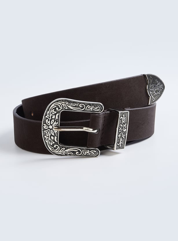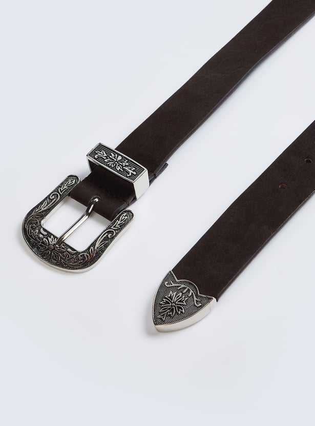 Complete your look with this solid belt, featuring a stylish buckle and a tang closure for a secure fit. A versatile accessory that adds a polished touch to any outfit.