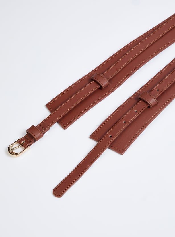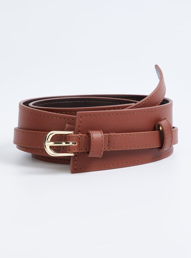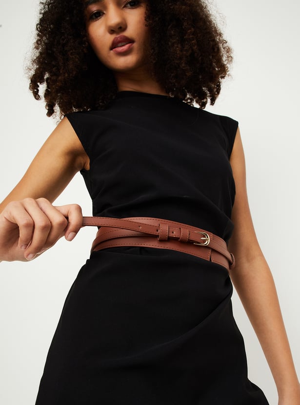 This solid belt is a versatile accessory that adds structure and style to any outfit. Designed with a classic tang closure, it can be effortlessly worn over tops, dresses, or high-waisted bottoms for a polished finish.