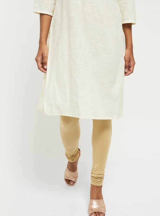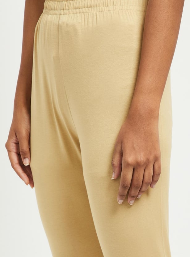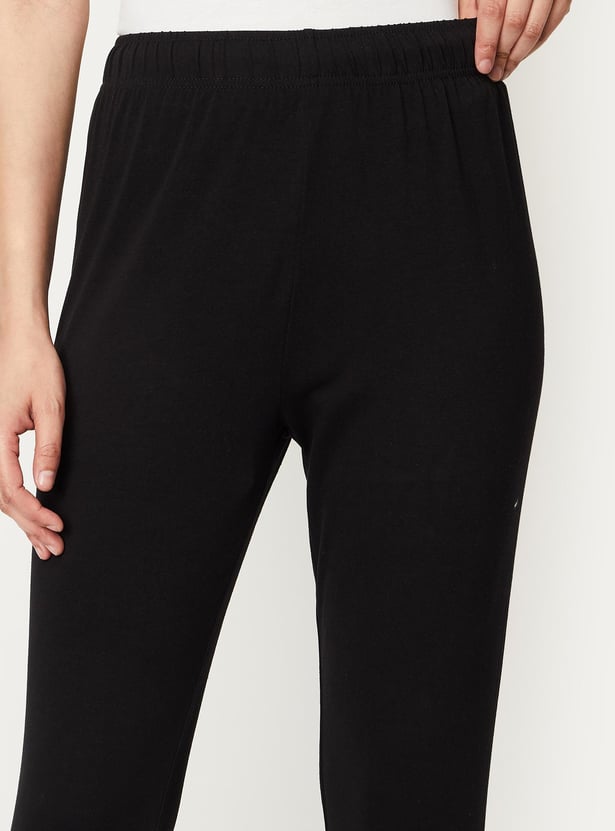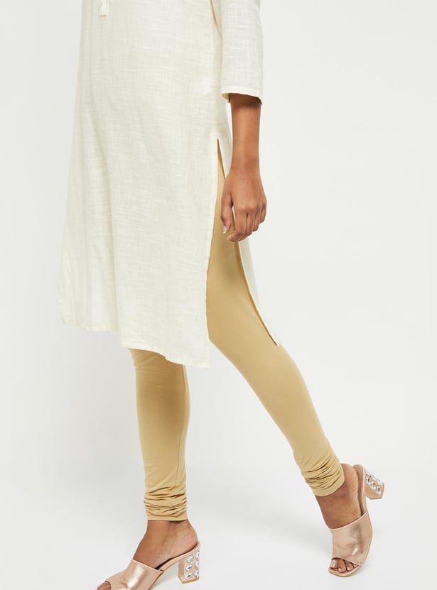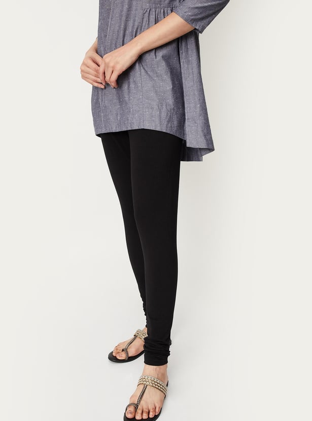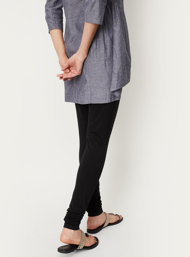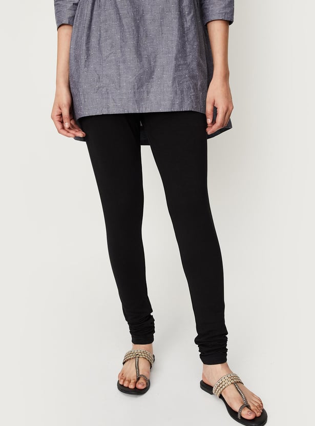 These solid churidars feature an elasticated waist and gathered hems.