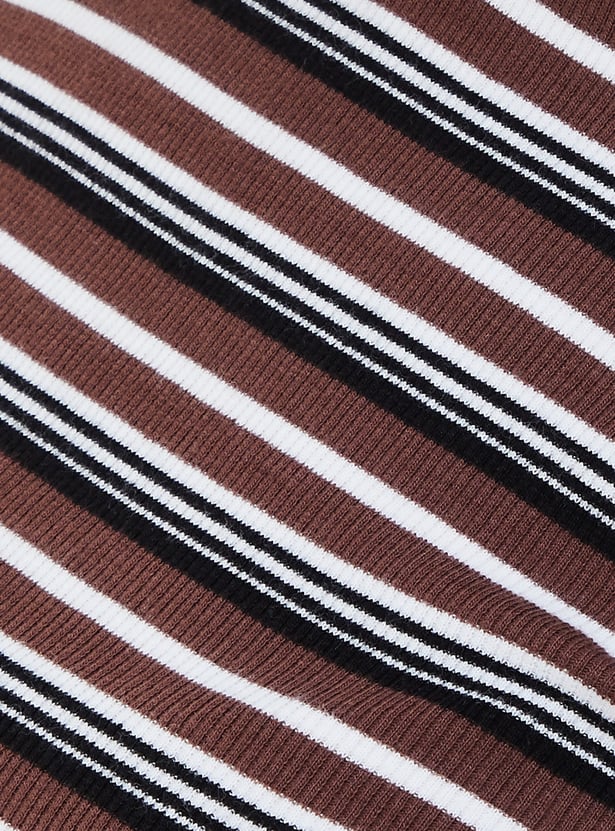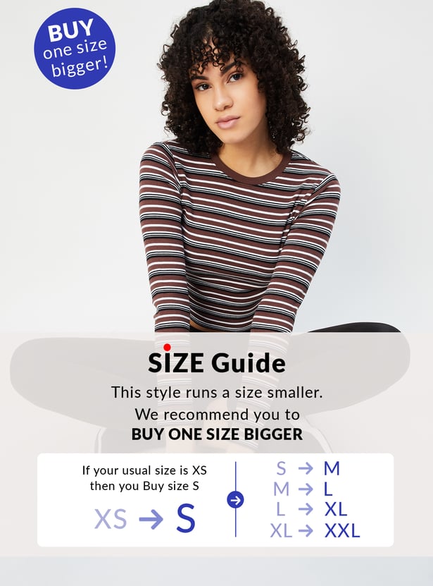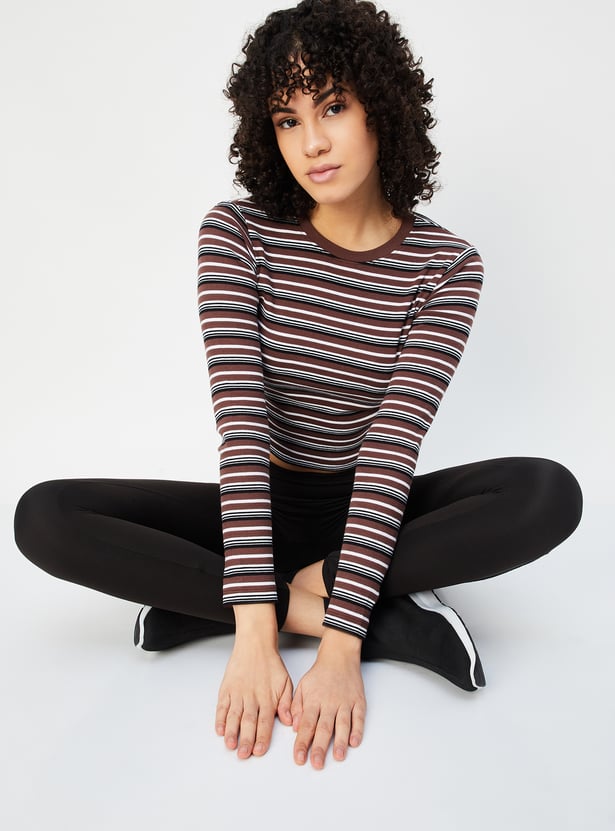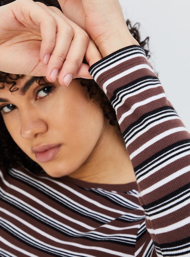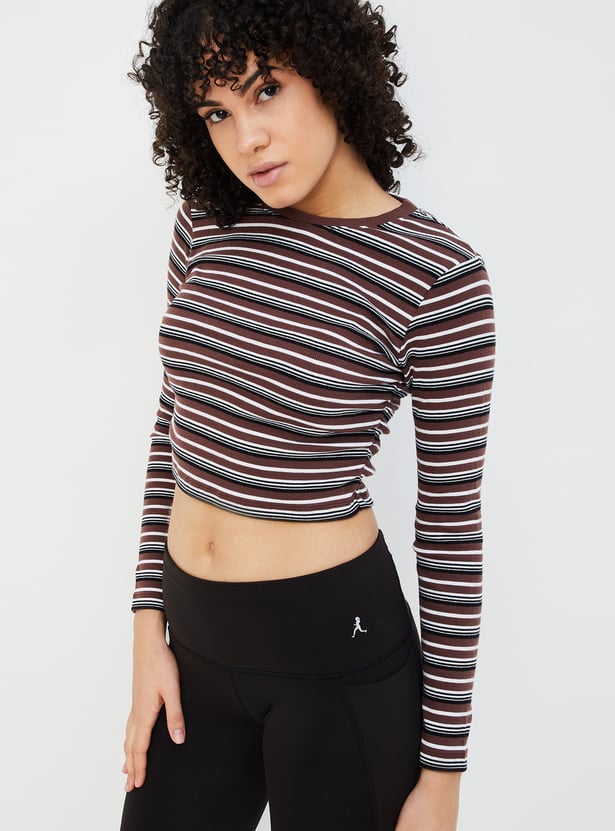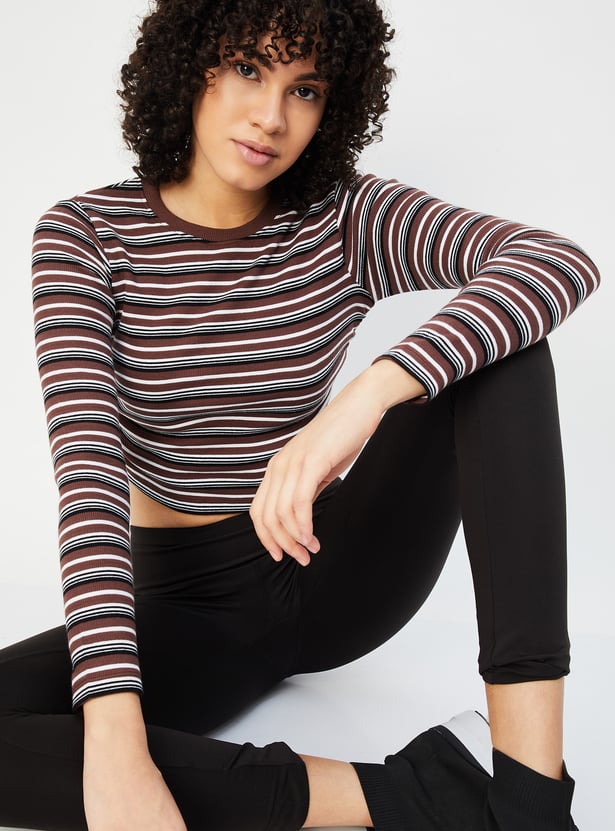 Elevate your casual ensemble with this striped cropped t-shirt featuring full sleeves and a round neck, adding a trendy flair to your look.
