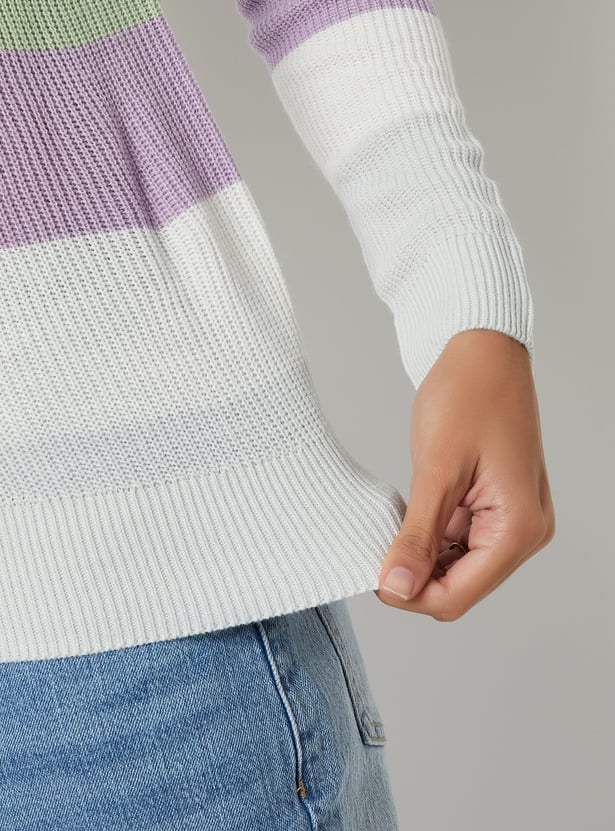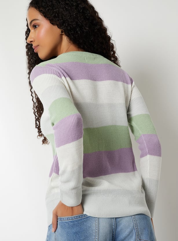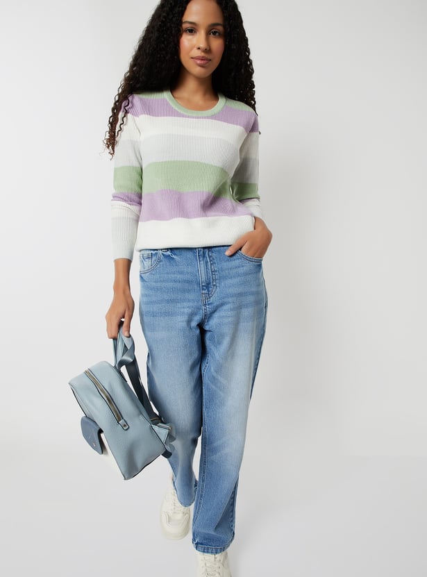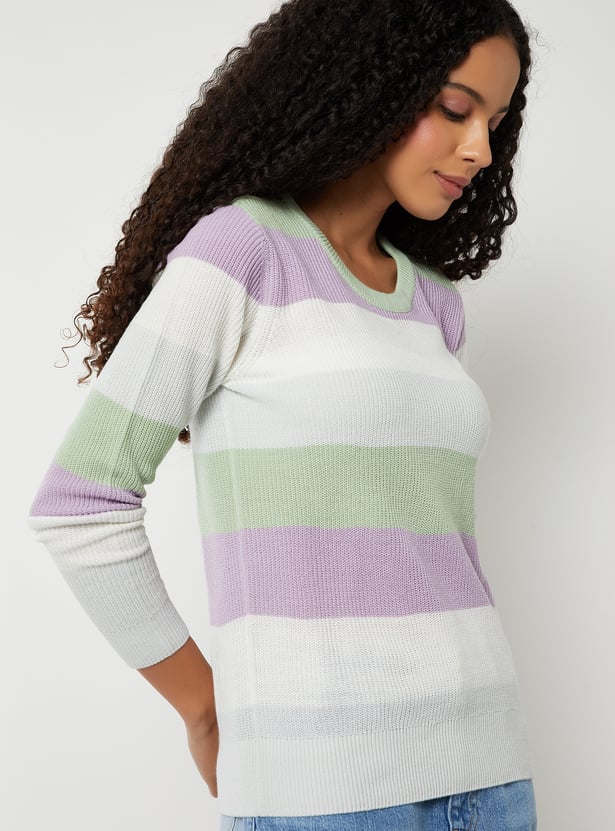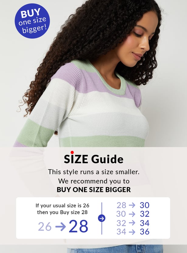Stay sharp and snug with this striped slim fit sweater, designed with a classic round neck and full sleeves. It’s a go-to layer for cool, casual days. Model Size :