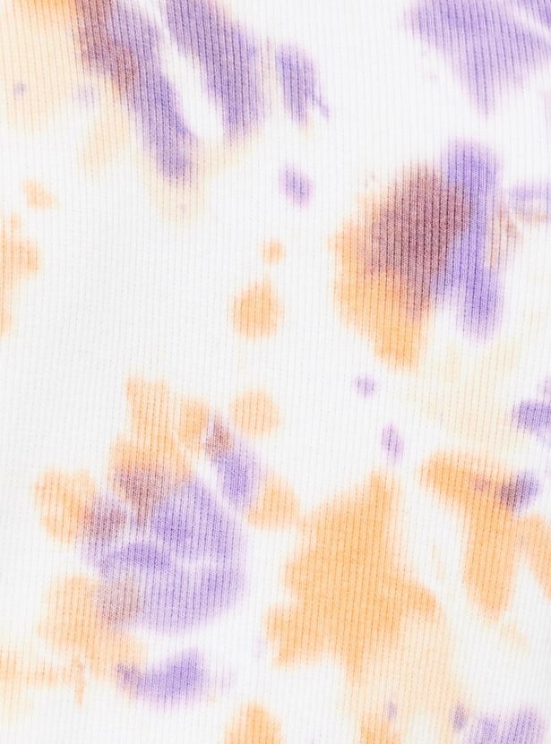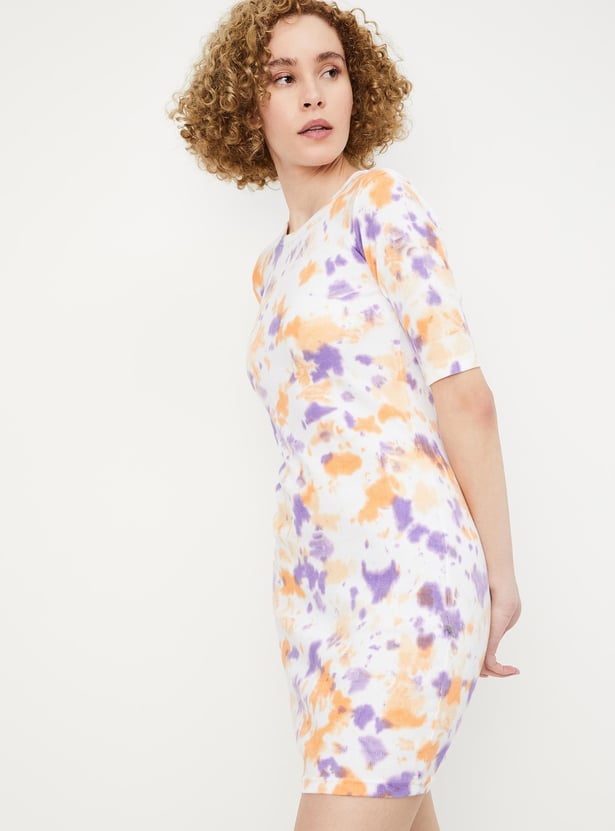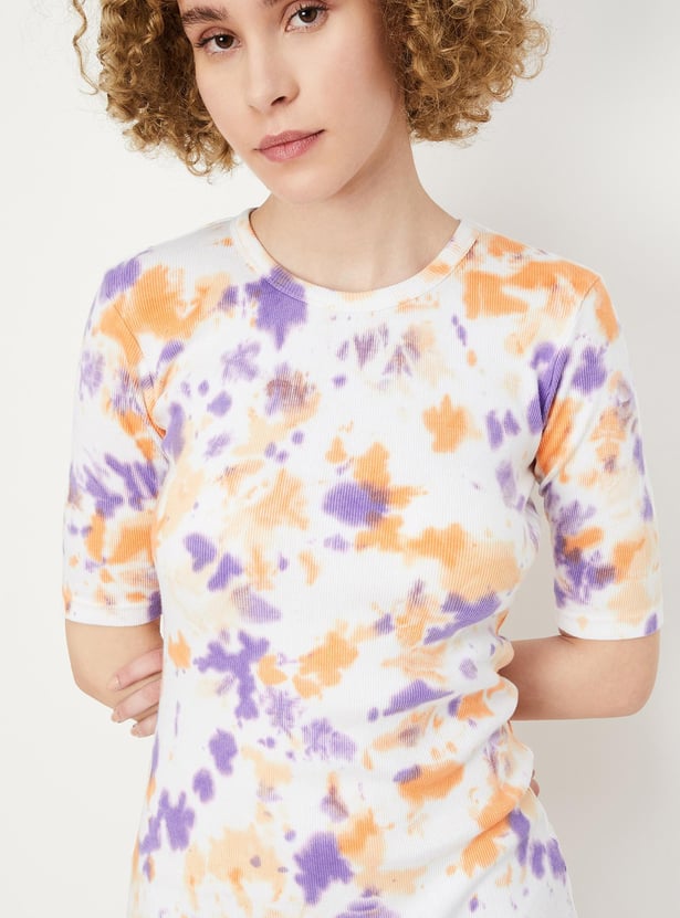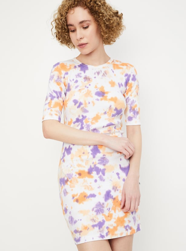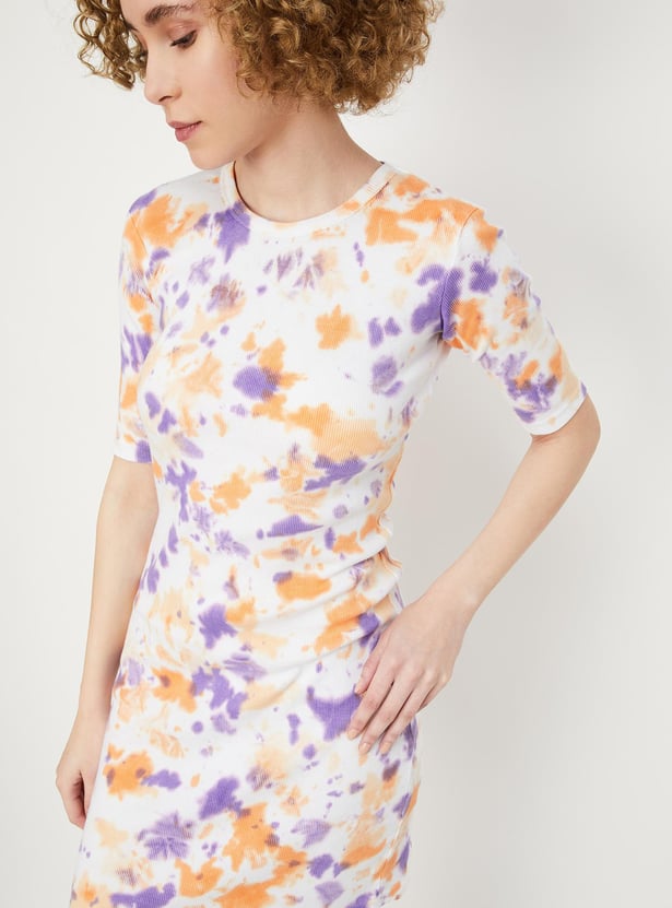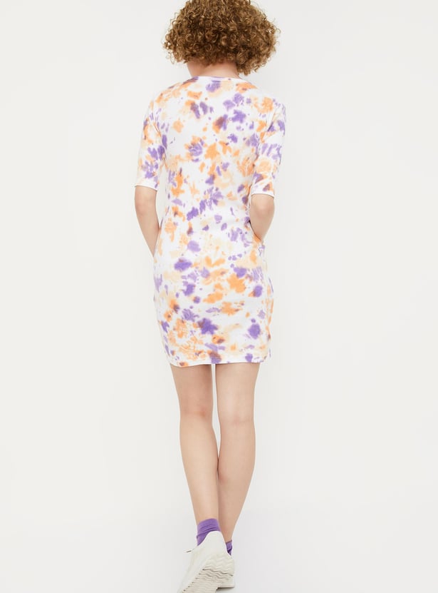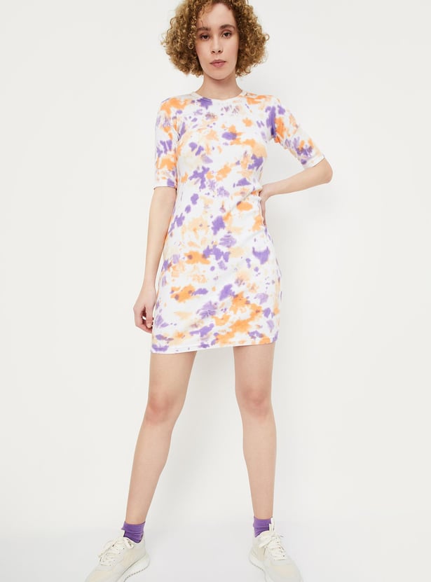 Add flair to your weekend wardrobe with this vibrant tie-dye dress, featuring a ribbed surface, round neckline, half sleeves, and a mini length for a stylish ensemble.