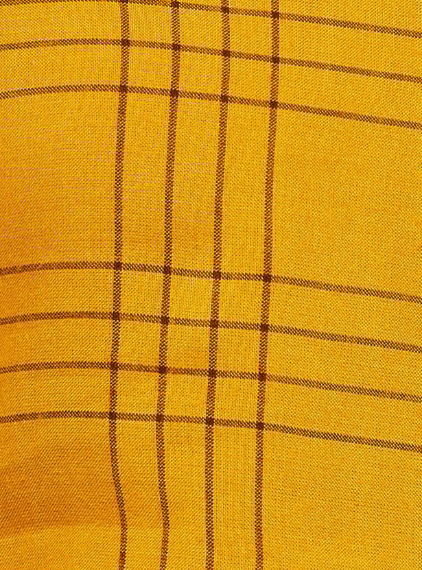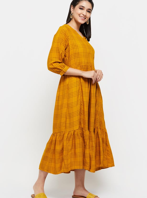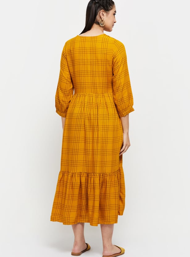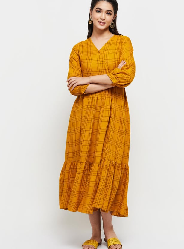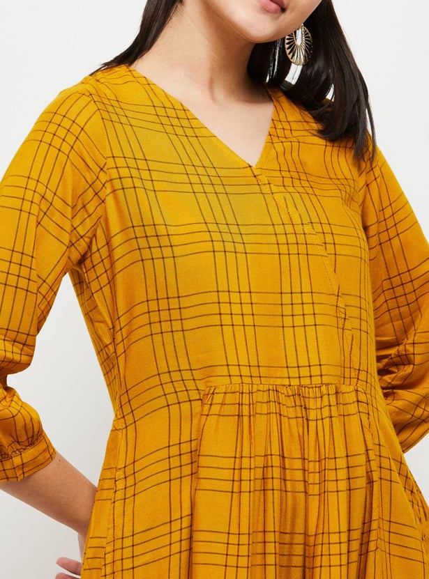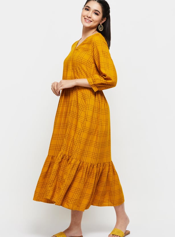 Gear up your brunch look with this midi dress designed with a checked surface, V neckline, and three-quarter sleeves.
