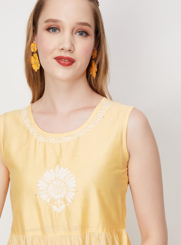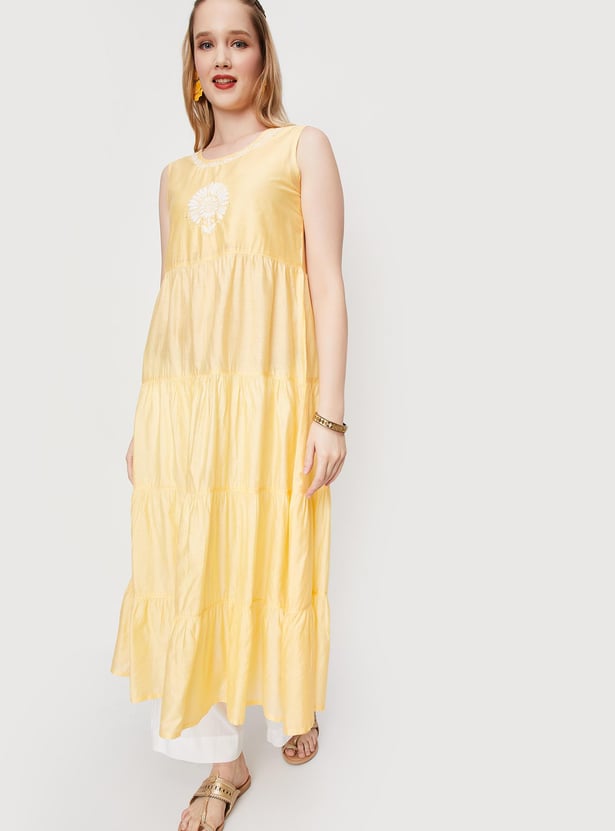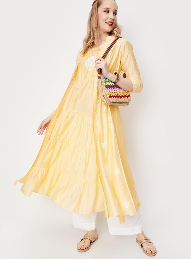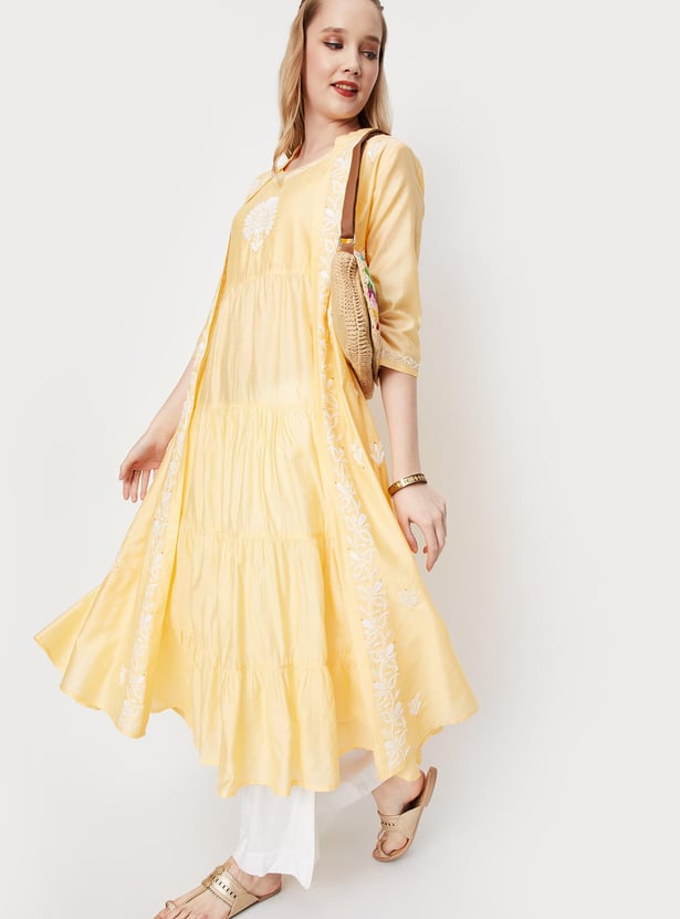 Look ethnic chic in this A-line kurta featuring a round neck, sleeveless construction, tiered profile, and chikankari detailing. It comes with an embroidered jacket with a front open, band collar and three-quarter sleeves. Pair this set with palazzos and flat sandals for an elevated style.