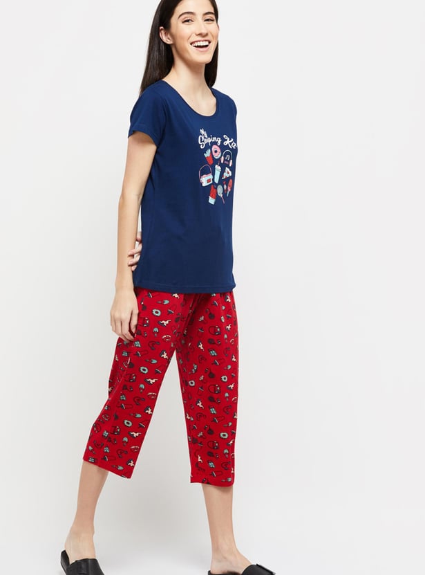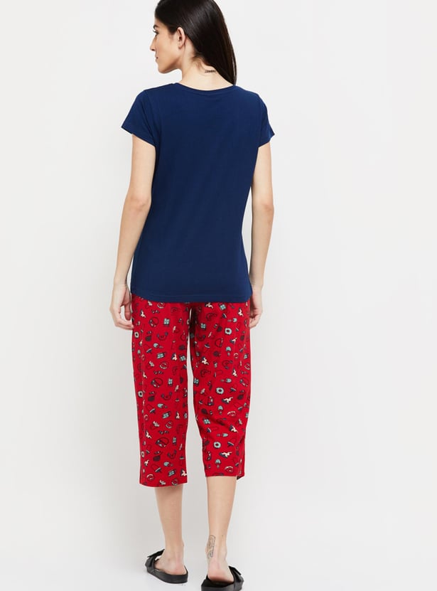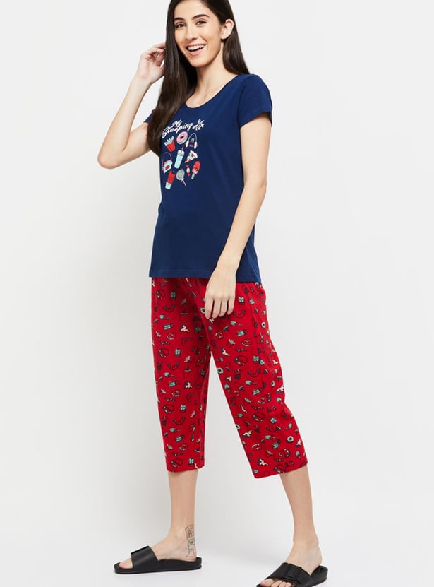 Women Printed Round Neck T-shirt With Elasticated Capri Pant