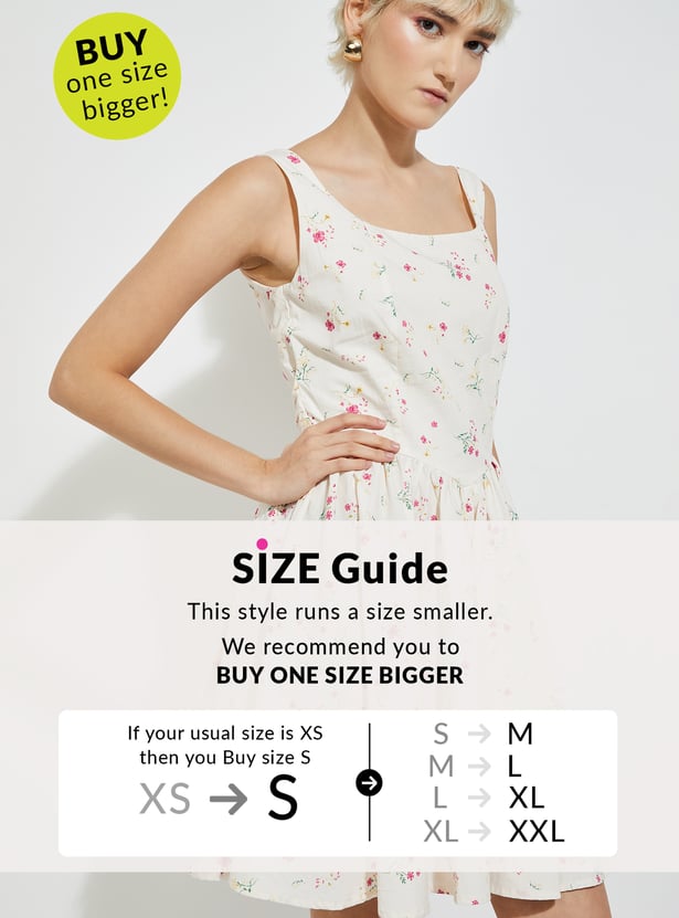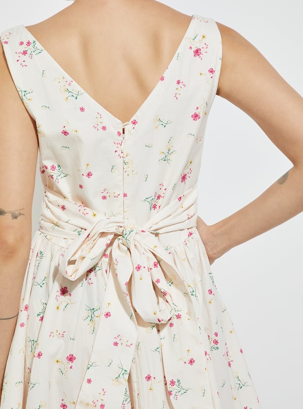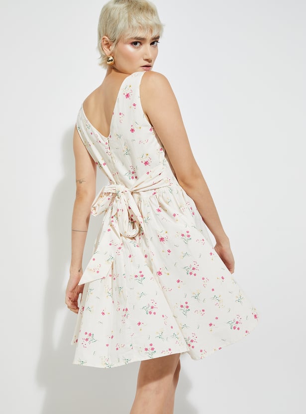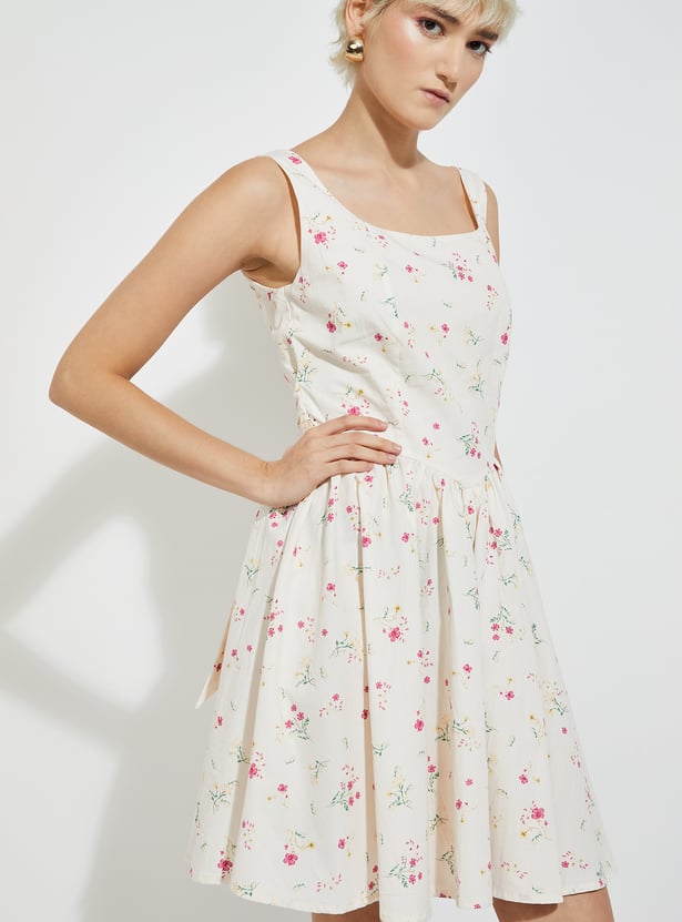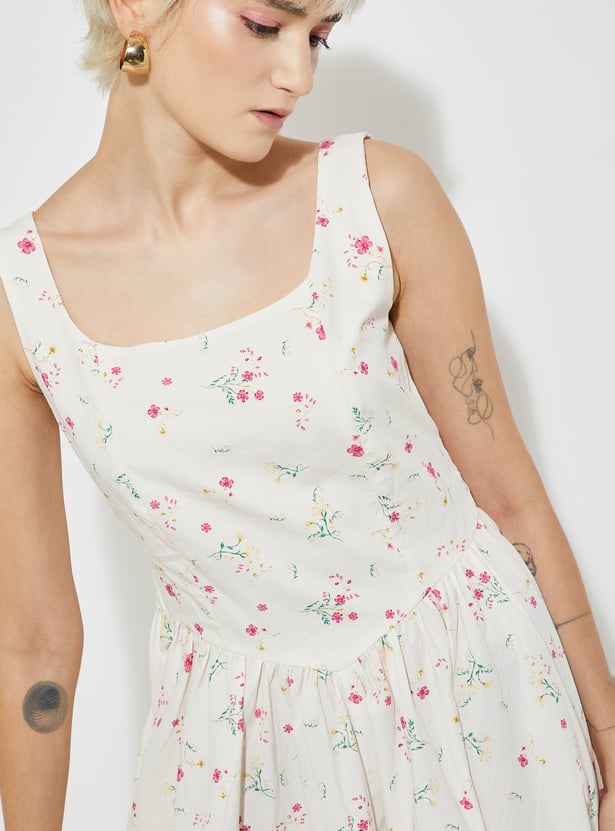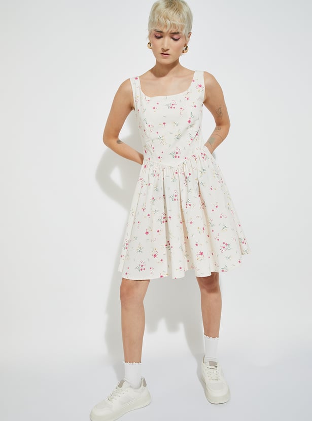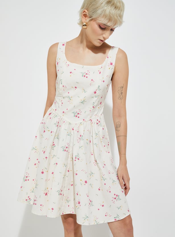 Feminine and flattering, this floral print A-line dress features a square neck, sleeveless design, and a zip closure. A belt at the back cinches the waist for a perfect fit.