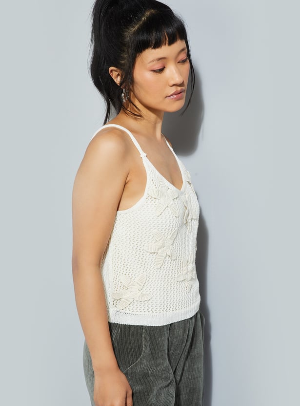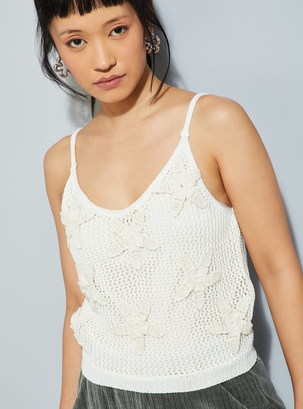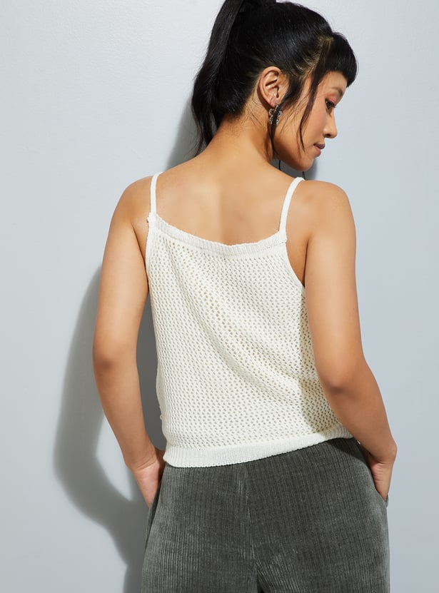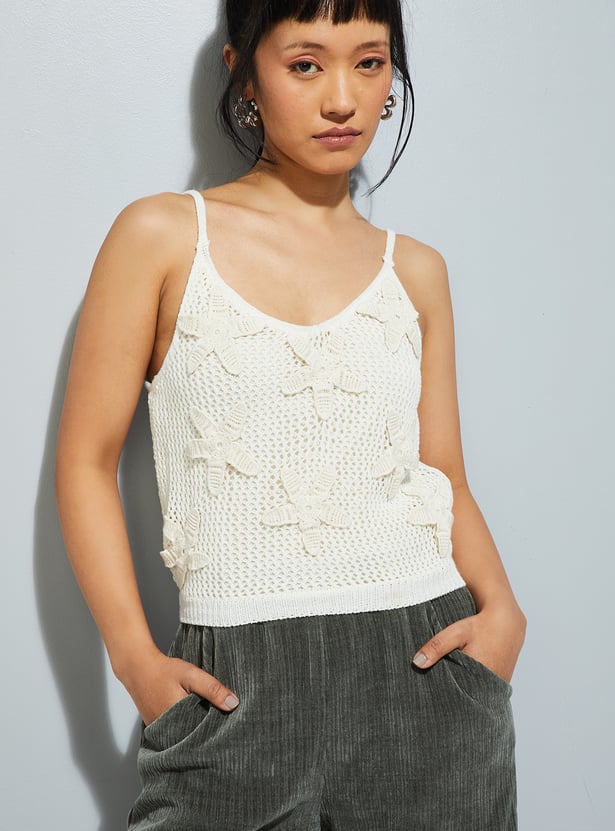 Light and breezy, this crochet knit top features a classic round neck and delicate shoulder straps. Its airy texture and handcrafted charm make it a versatile piece, perfect for layering or wearing solo on warm days.