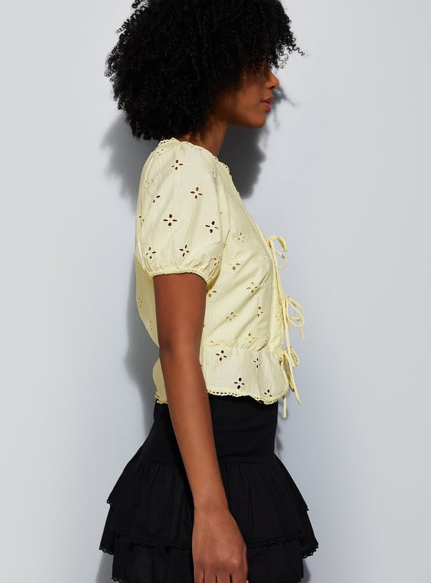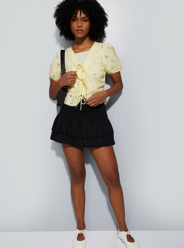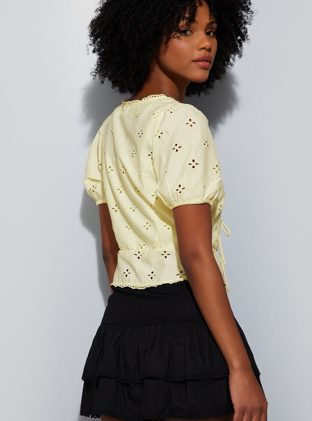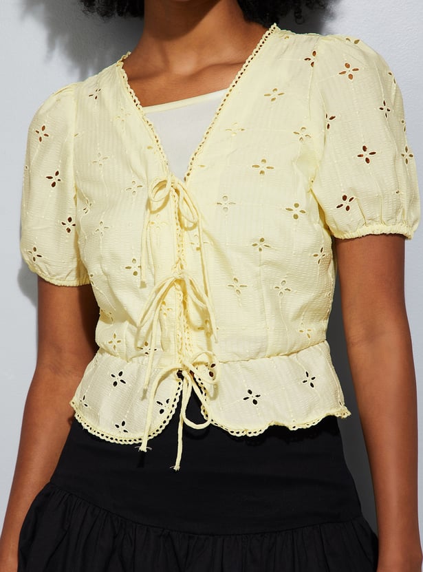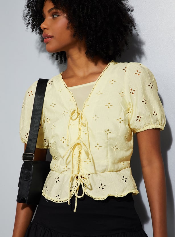 Elevate your everyday style with this Schifilli top. featuring a flattering V-neck, puffed sleeves, and a chic tie-up detail, perfectly paired with a soft camisole for effortless layering.