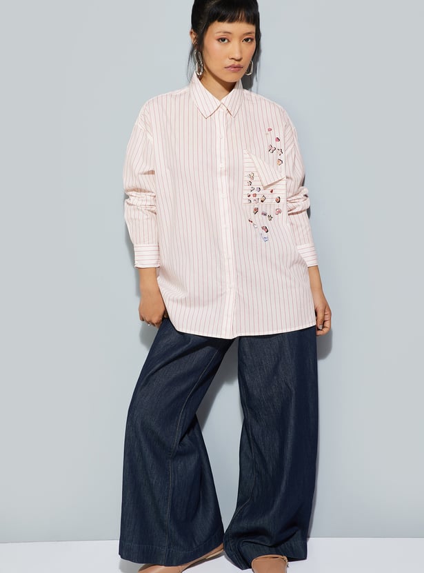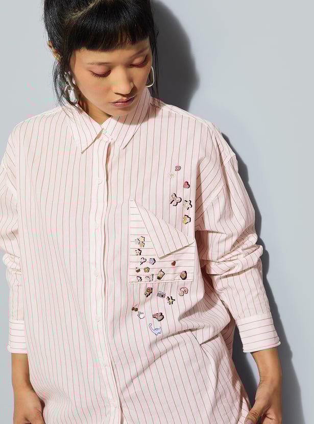 Relaxed yet refined, this striped oversized shirt features a classic spread collar and button placket for timeless appeal. Designed with full sleeves finished with button cuffs and a patch pocket applique, it blends effortless comfort with understated sophistication.
