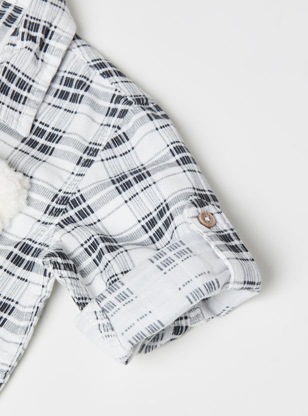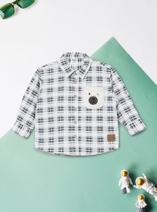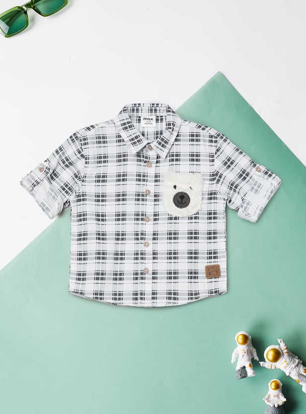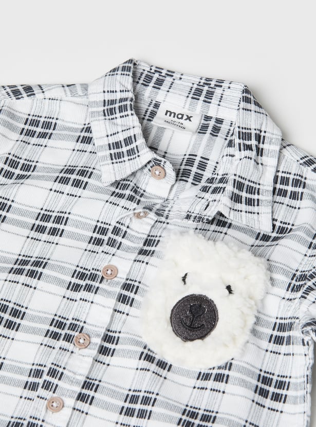 Add a playful twist to your wardrobe with this checked shirt. Designed with a spread collar, button closure, and full sleeves, it features a charming bear applique that makes it stand out while keeping the look casual and stylish.