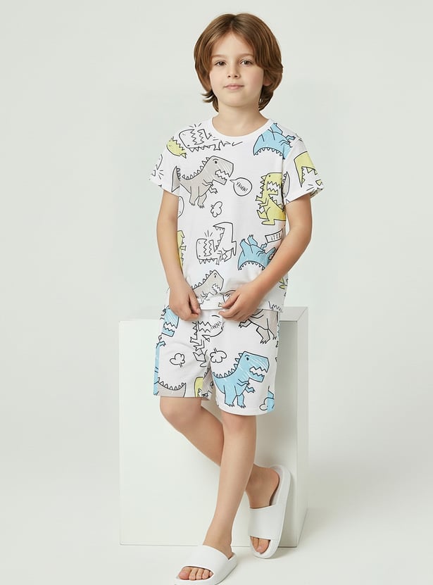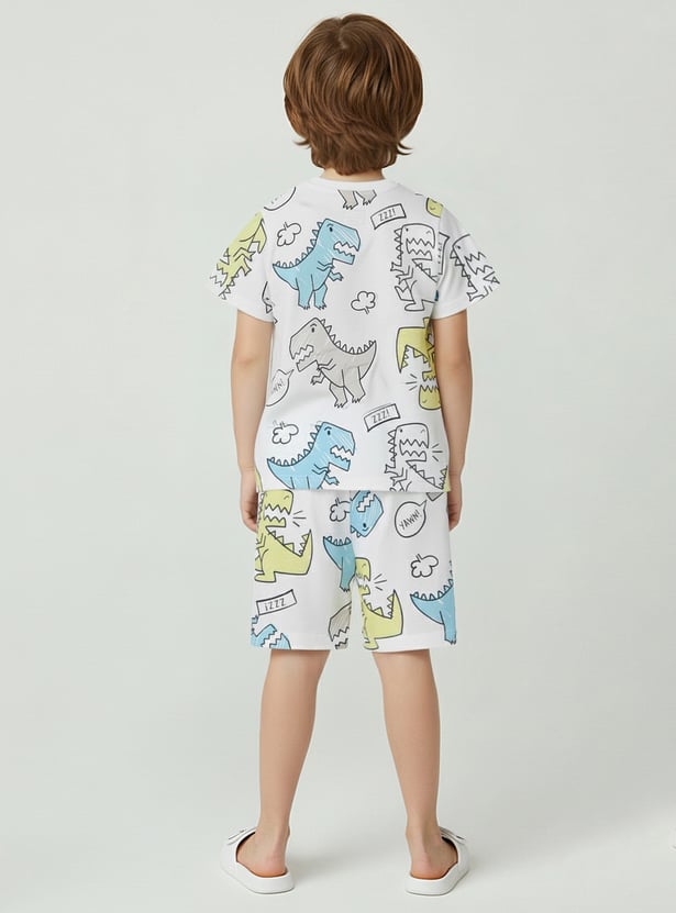 Let them roar in style! This fun and comfy dino print set includes a soft T-shirt with a classic crew neck and half sleeves, paired with matching shorts featuring a drawstring closure for a secure fit.